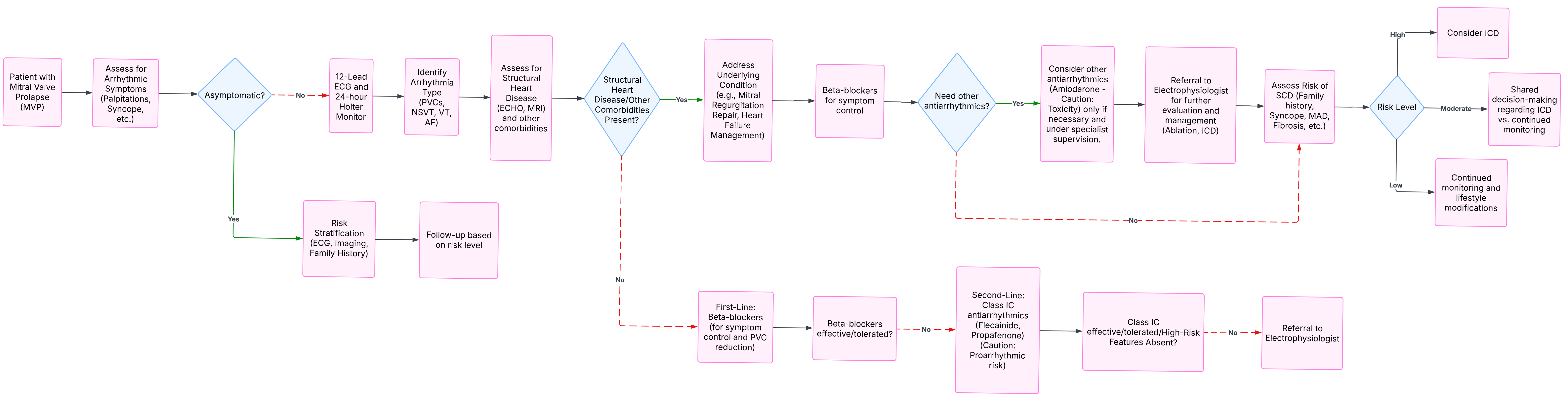 MVP is considered a benign condition; however, over time, the MV can undergo several changes that may require some degree of monitoring or treatment. The current perspective on MVP management, with or without arrhythmia, is presented in Fig. 8.