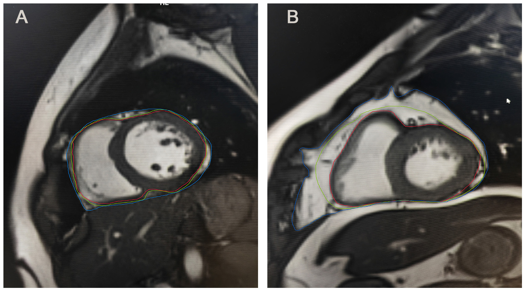 Fig. 1. Epicardial and pericardial adipose tissue on MRI. (A) Epicardial and pericardial adipose tissue on MRI of individual A. (B) Epicardial and pericardial adipose tissue on MRI of individual B. Individual B exhibited a greater amount of pericardial adipose tissue and epicardial adipose tissue compared to individual A. Epicardial adipose tissue is located between the red and green lines, whereas pericardial adipose tissue is situated between the green and blue lines. MRI, magnetic resonance imaging.