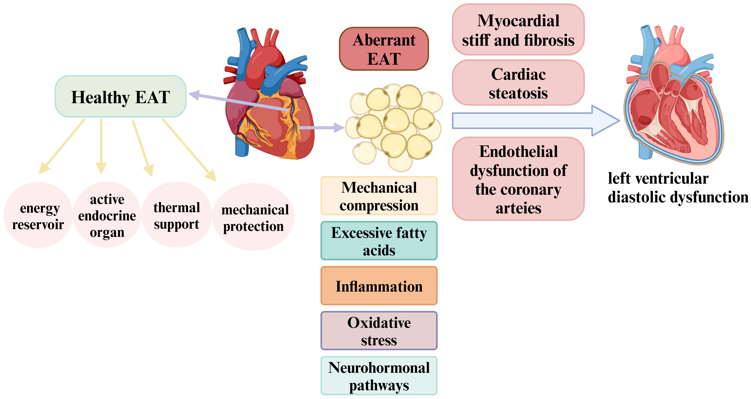 Left ventricular diastolic dysfunction (LVDD) is commonly defined as impaired myocardial relaxation with normal ejection fraction and the absence of heart failure symptoms [1]. Its development and progression correlate with various comorbidities, including hypertension, obesity, diabetes, and others [2]. If not properly treated, LVDD will evolve into heart failure, leading to increased mortality [3]. Various mechanisms have been proposed to explain relaxation abnormalities, including disruptions in energy metabolism, calcium ion homeostasis, and myofilament function, as well as inflammation and oxidative stress [4, 5, 6]. Nonetheless, these mechanisms inadequately account for the pathophysiological processes underlying the occurrence and progression of diastolic dysfunction. Over the past decades, converging evidence has demonstrated that epicardial adipose tissue (EAT) is an independent risk factor for LVDD.