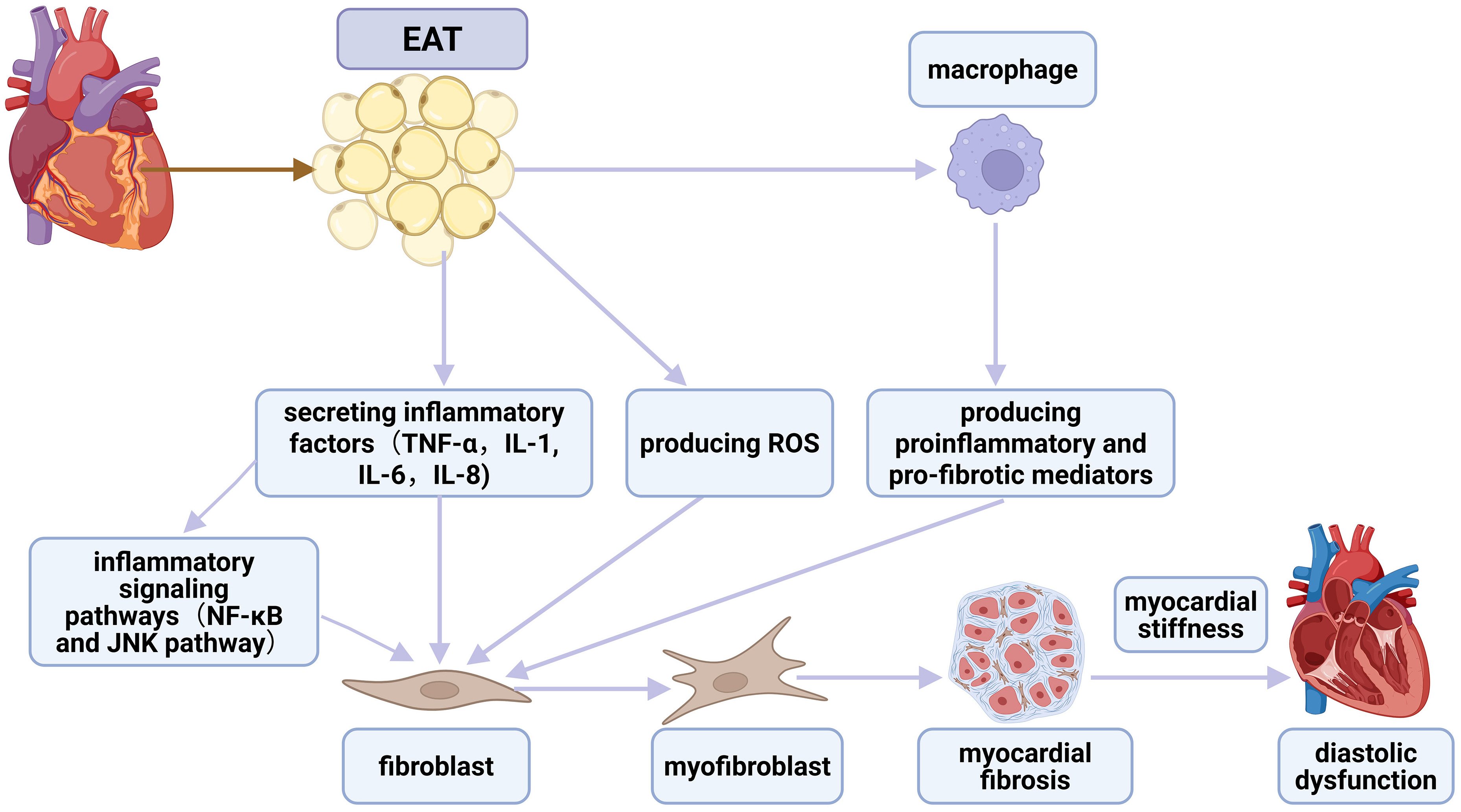Fig. 3. The association between EAT, inflammation, fibrosis, and diastolic dysfunction. EAT secretes inflammatory cytokines that directly activate cardiac fibroblasts, promoting their differentiation into myofibroblasts. This process is further facilitated by inflammatory signaling pathways, notably NF-