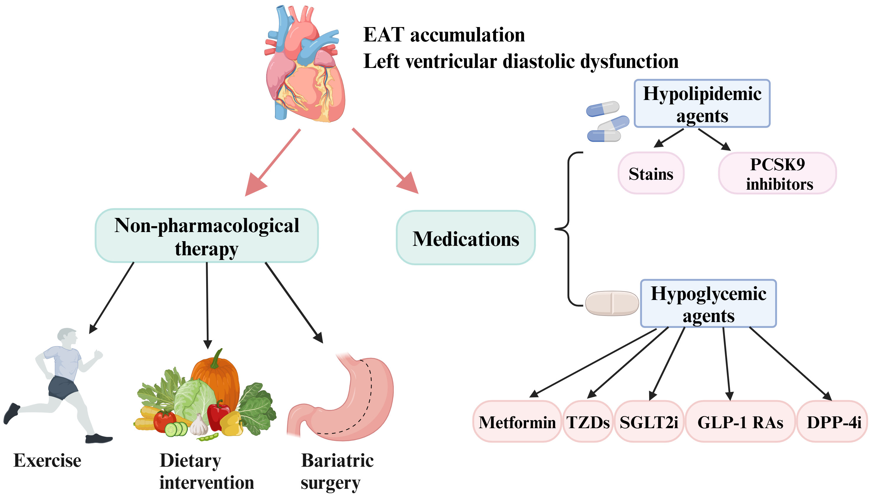 Fig. 4. Current interventions aimed at reducing EAT and improving diastolic function include pharmacological and non-pharmacological therapies. Some agents such as metformin, TZDs, SGLT2i, GLP-1 RAs, DPP-4i, and hypolipidemic agents have shown promise in decreasing EAT deposition and ameliorating diastolic function. In addition, lifestyle modifications (exercise and diet) and bariatric surgery have demonstrated beneficial effects in inhibiting EAT expansion and improving diastolic function. EAT, epicardial adipose tissue; PCSK9, proprotein convertase subtilisin/kexin type 9; DPP-4i, dipeptidyl peptidase-4 inhibitors; GLP-1 RAs, glucagon-like peptide-1 receptor agonists; SGLT2i, sodium-glucose cotransporter-2 inhibitors; TZDs, thiazolidinediones. Created with https://www.biorender.com.