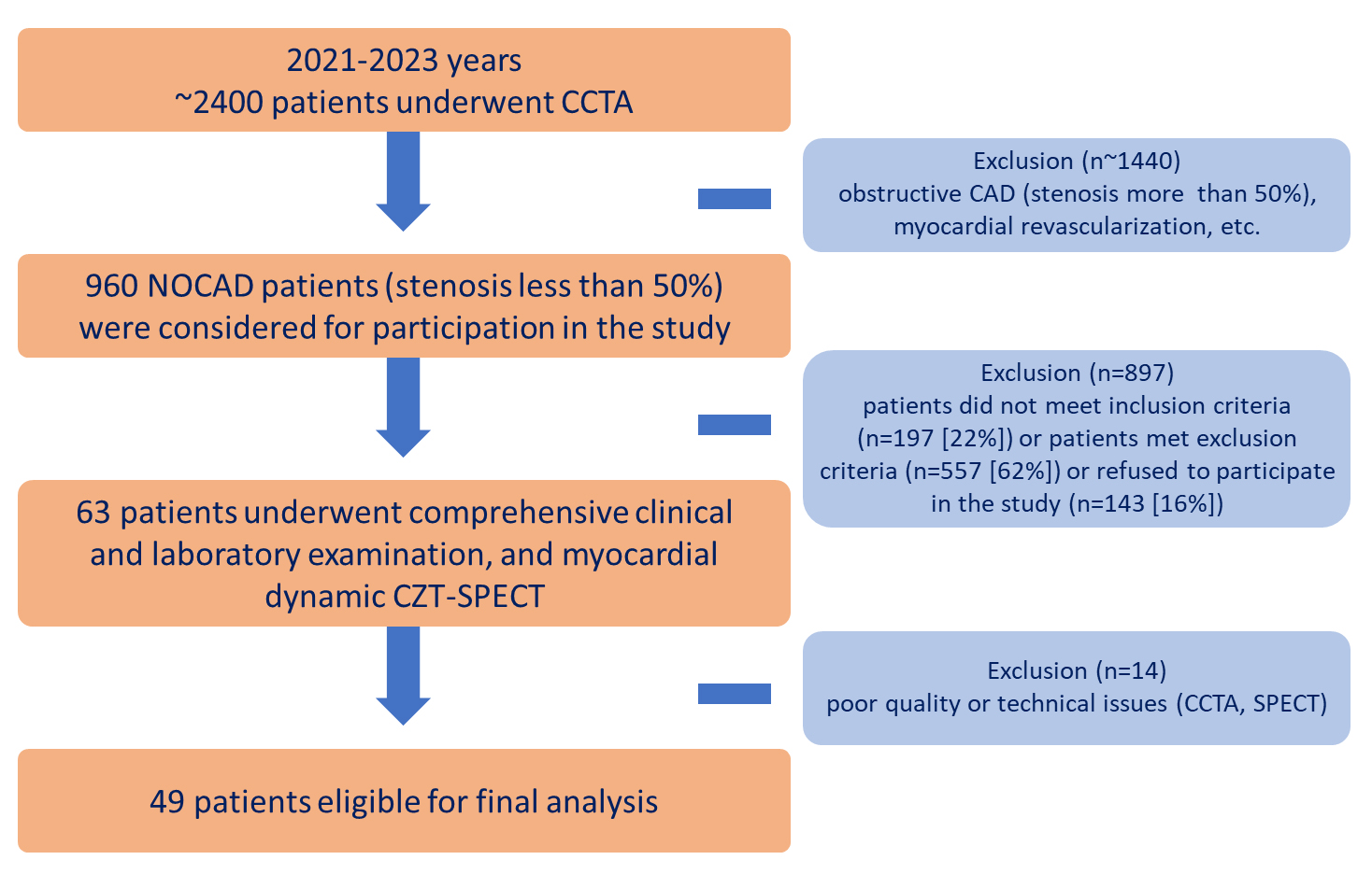 A total of 49 patients were enrolled in the final analysis. All patients underwent a comprehensive clinical examination, which included a medical history, blood tests (complete blood count, blood biochemistry test, lipid profile, hemostasis panel), electrocardiography, echocardiography, CCTA, and myocardial dynamic CZT-SPECT perfusion imaging with the assessment of MBF and MFR. Image processing was performed at the Core Facility “Medical Genomics”.
