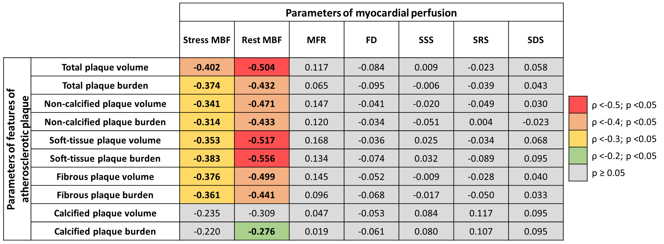 Stress and rest MBF values are associated with total and non-calcified (soft-tissue and fibrous) plaque volume and burden. Interestingly, MFR, FD, and standard indexes of myocardial perfusion impairment were not significantly associated with quantitative CCTA parameters. The heatmap graph of associations regarding atherosclerotic plaque features and MBF in NOCAD patients is shown in Fig. 2.