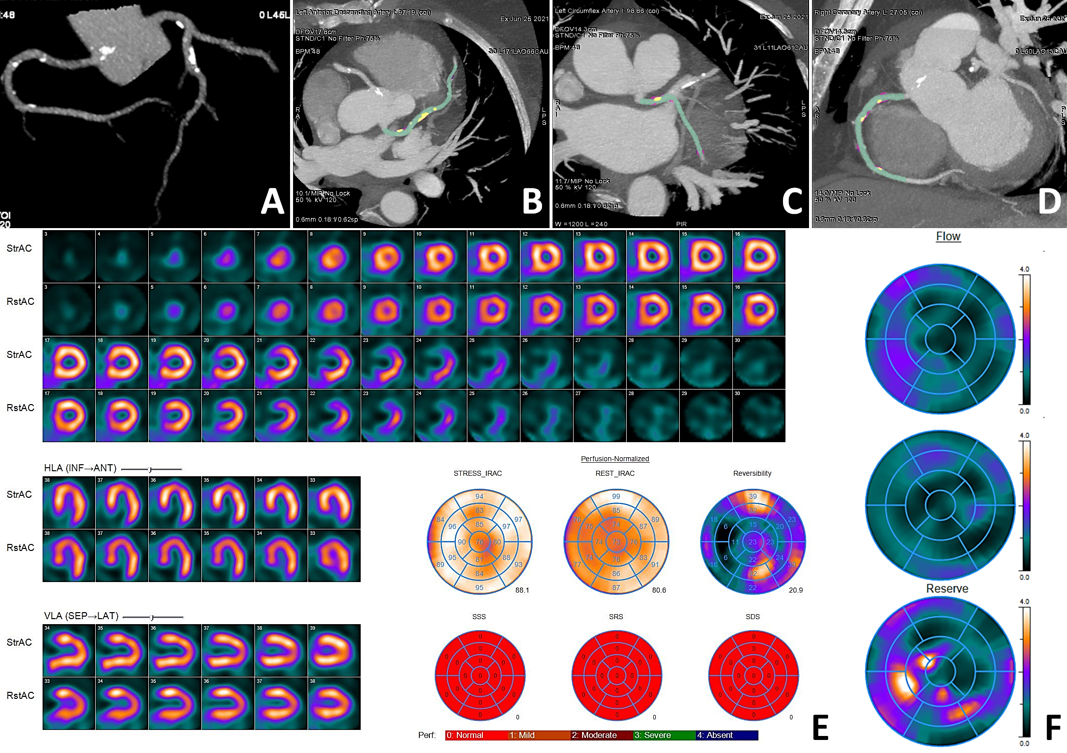 Fig. 3. Clinical case of a NOCAD patient with reduced stress MBF. Patient K., female, 56 years old, arterial hypertension, dyslipidemia. CCTA ((A) three-dimensional reconstruction of the coronary tree; (B) MIP of the LAD; (C) MIP of the LCX; (D) MIP of the RCA): diffuse NOCAD; maximum stenosis 40% in the proximal segment of the LAD; total plaque volume 288.2 mm3; total plaque burden 15.2%; non-calcified plaque volume 239.1 mm3; non-calcified plaque burden 12.6%; soft tissue plaque volume 9.5 mm3; soft tissue plaque burden 0.5%; fibrous plaque volume 229.6 mm3; fibrous plaque burden 12.1%; calcified plaque volume 49.1 mm3; calcified plaque burden 2.6%. MPI (E): normal myocardial perfusion; SSS 0; SRS 0; SDS 0. Myocardial dynamic CZT-SPECT (F): reduced stress MBF 0.91 mL/min/g, rest MBF 0.74 mL/min/g, reduced MFR 1.23, FD 0.17 mL/min/g. Green indicates the lumen of the coronary arteries, yellow indicates the calcified structural components of the plaque, and purple indicates the fibrous structural components of the plaque. CAD, coronary artery disease; CCTA, coronary computed tomography angiography; CZT, cadmium–zinc–telluride detectors; FD, flow difference; LAD, left anterior descending artery; LCX, left circumflex artery; MBF, myocardial blood flow; MIP, maximum intensity projection; MFR, myocardial flow reserve; MPI, myocardial perfusion imaging; NOCAD, non-obstructive coronary artery disease; RCA, right coronary artery; SDS, summed difference score; SPECT, single-photon emission computed tomography; SRS, summed rest score; SSS, summed stress score.