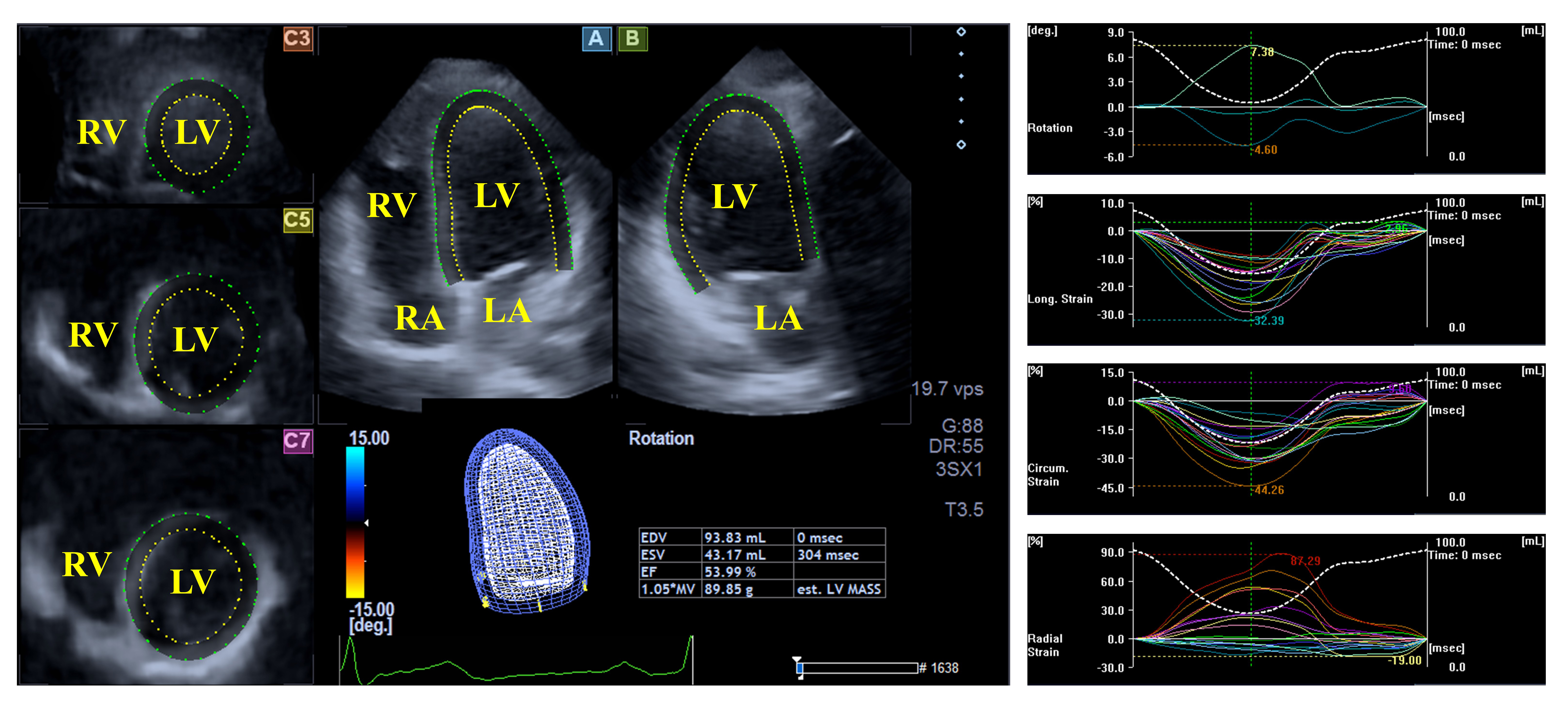 Fig. 1. Evaluation of the left ventricular volumes, rotational parameters and strains by three-dimensional speckle-tracking echocardiography. Abbreviations: LA, left atrium; RA, right atrium; LV, left ventricle; RV, right ventricle.