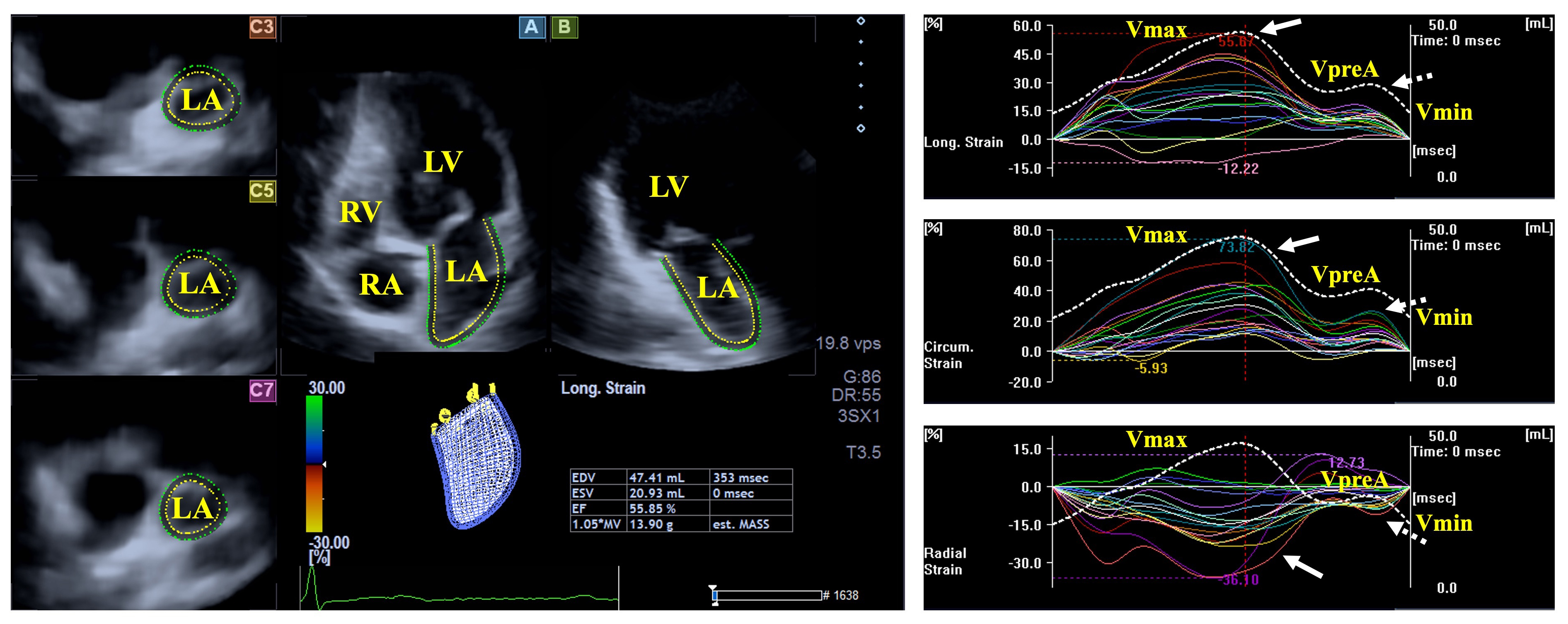 Fig. 2. Evaluation of the left atrial volumes and strains by three-dimensional speckle-tracking echocardiography. Abbreviations: LA, left atrium; RA, right atrium; LV, left ventricle; RV, right ventricle; Vmin, end-diastolic minimum volume of the LA; VpreA, early diastolic pre-atrial contraction volume of the LA; Vmax, maximum end-systolic volume of the LA, white arrow represents LA reservoir strain, dashed white arrow represents LA strain at atrial contraction.