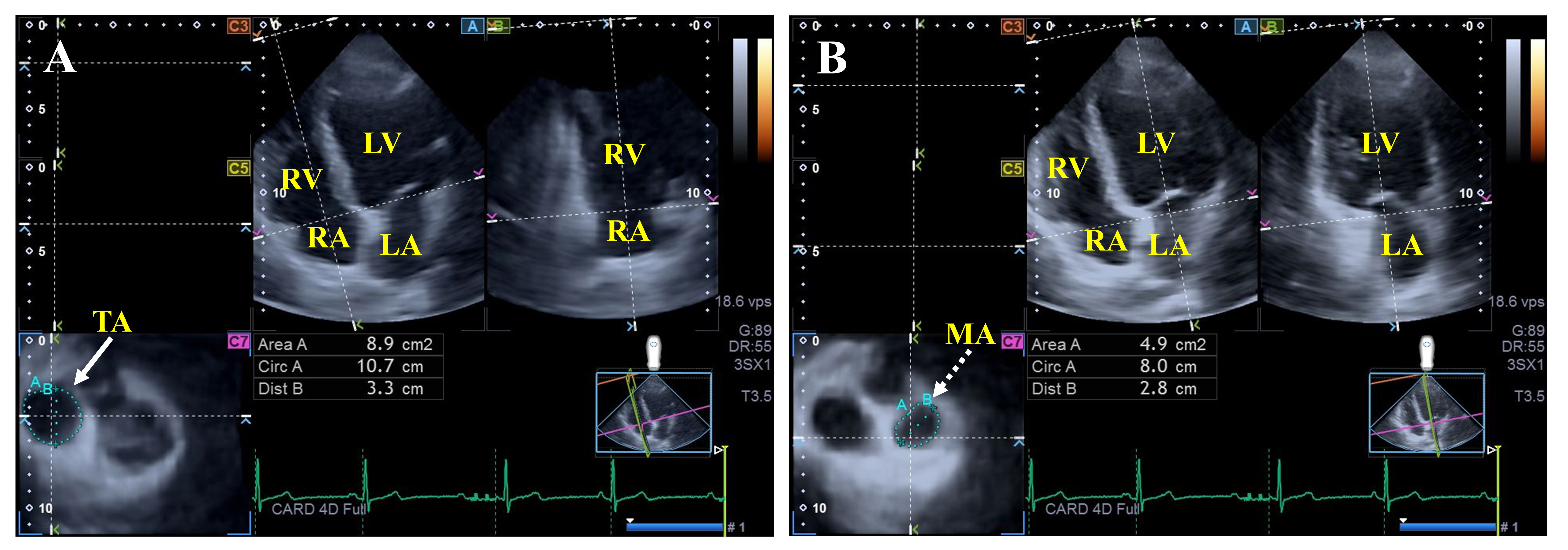 Fig. 3. Assessment of the tricuspid (A) and mitral annular (B) dimensions by three-dimensional speckle-tracking echocardiography. Abbreviations: LV, left ventricle; RA, right atrium; LA, left atrium; RV, right ventricle; Dist, diameter; Area, area; Circ, perimeter; TA, tricuspid annulus; MA, mitral annulus.
