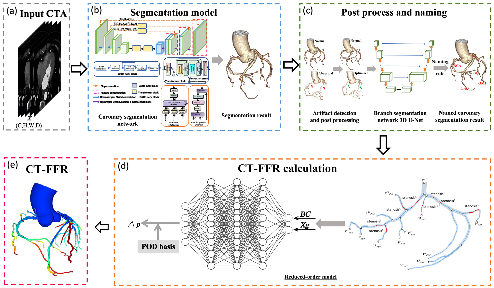 Fig. 1. Workflow for fully automatic ML-based CT-FFR calculation. (a) CCTA images are used as the initial input. (b) An artificial intelligence-based segmentation model reconstructs the coronary artery tree in 3D. (c) Segmentation features of the reconstructed tree are extracted to compute CT-FFR values. (d) Regional blood flow, in both non-stenotic and stenotic segments, is reconstructed using POD coefficients and basis, allowing calculation of the pressure drop across lesions. (e) A neural network infers the POD coefficients by integrating boundary conditions (BC) and compressed Xg that represent the vessel morphology of stenotic and non-stenotic regions. CTA, computed tomographic angiography; BC, boundary conditions; Xg, shape features; POD, proper orthogonal decomposition; CT-FFR, coronary computed tomography angiography-derived fractional flow reserve; ML, machine learning; LAD, left anterior descending artery; RCA, right coronary artery; RI, ramus intermedius; OM1, first obtuse marginal branch; D1, first diagonal branch; 3D, three-dimensional. (Reprinted from Guo et al. [8] with permission from Elsevier).