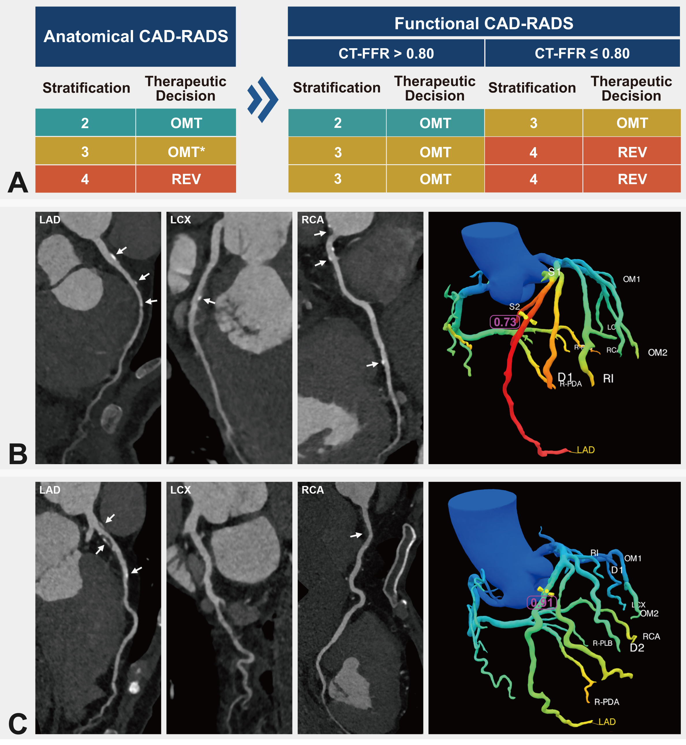 Fig. 2. Functional CAD-RADS scoring criteria and case illustrations. (A) CT-FFR-based functional CAD-RADS scoring system. (B) Case illustration. A 52-year-old male presenting with 25% stenosis in the mid-segment of the LAD was classified as CAD-RADS 2. The lesion-specific CT-FFR value was 0.73, leading to a functional CAD-RADS classification of 3. (C) Case illustration. A 70-year-old male with 80% stenosis in the pro-segment of the LAD was classified as CAD-RADS 4. The lesion-specific CT-FFR value was 0.91, leading to a functional CAD-RADS classification of 3. CAD-RADS, Coronary Artery Disease-Reporting and Data System; CT-FFR, coronary computed tomography angiography-derived fractional flow reserve; OMT, optimal medical therapy; REV, revascularization; LAD, left anterior descending artery; LCX, left circumflex artery; RCA, right coronary artery. The white arrows indicate the locations of atherosclerotic plaques in the coronary arteries. * Indicates medical therapy in the category of anatomical CAD-RADS 3, whereas intensive medical therapy is usually suggested for functional CAD-RADS 3 lesions.