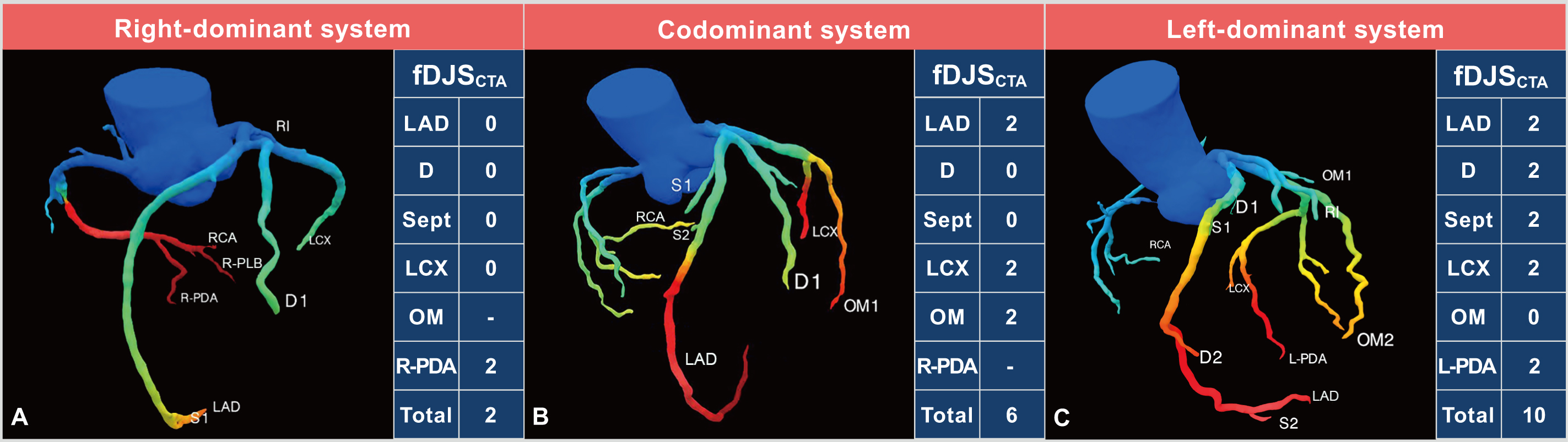 Fig. 3. CT-FFR based functional Duke Jeopardy Score system. (A) Right coronary artery dominance. (B) Coronary codominance. (C) Left coronary artery dominance. The functional Duke Jeopardy score system categorizes the coronary artery tree into six segments for patients with right coronary artery (RCA) dominance and coronary codominance: the left anterior descending artery (LAD), the largest diagonal branch (D), the largest septal perforating branch (Sept), the left circumflex artery (LCX), the largest obtuse marginal branch (OM), and the posterior descending artery of RCA (R-PDA). A CT-FFR value