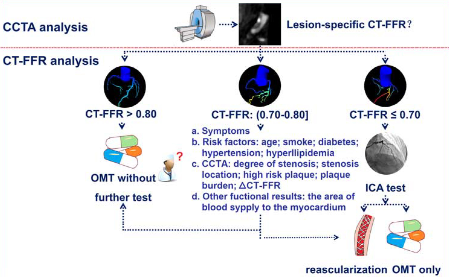 Fig. 4. Flowchart of CT-FFR applications and interpretation. CT-FFR, coronary computed tomography angiography-derived fractional flow reserve; CCTA, coronary computed tomography angiography; OMT, optimal medical therapy; ICA, invasive coronary angiography. (Reprinted from Zhang et al. [51] with permission from Wolters Kluwer Health).