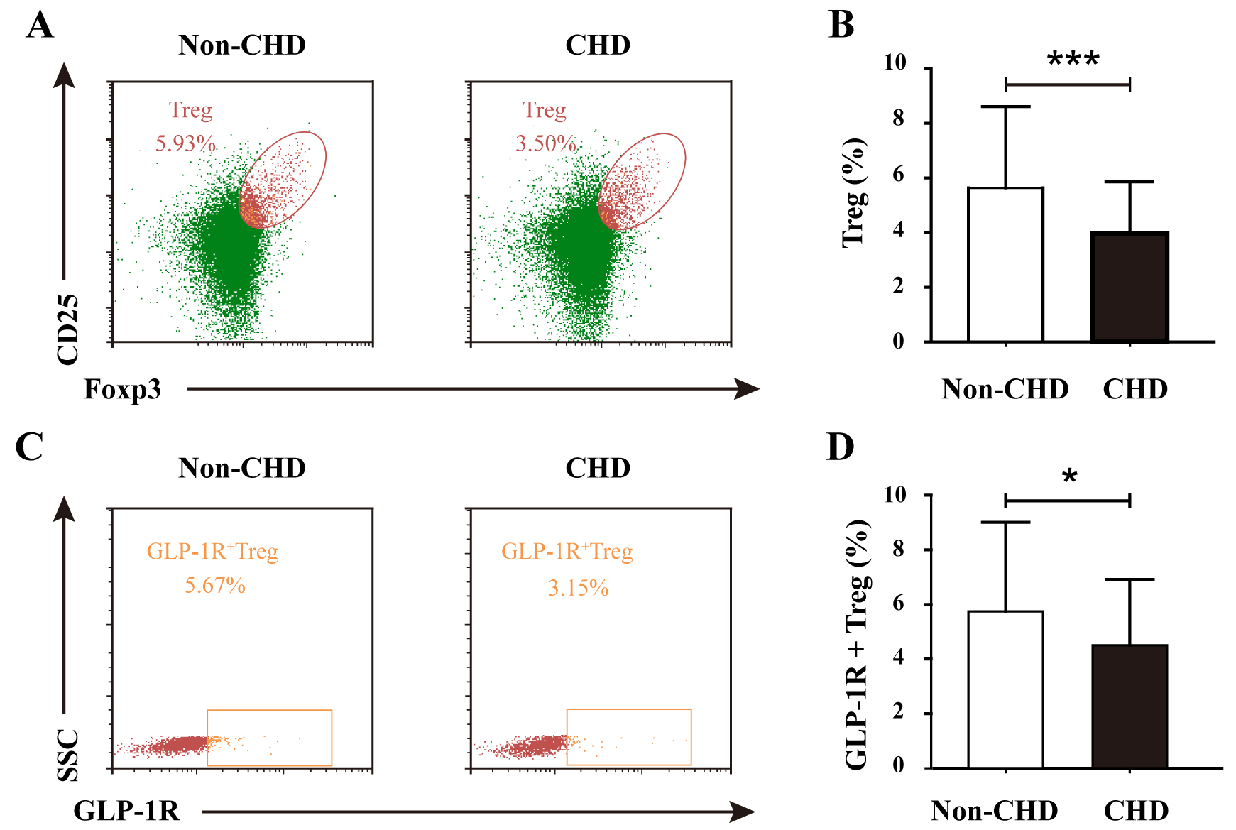 Fig. 1. Comparative analysis of Treg frequency and GLP-1R+ Treg subsets in non-CHD and CHD groups. (A) Representative flow cytometry plots gating CD4+CD25+FoxP3+ Tregs in the non-CHD and CHD groups. (B) Quantification of Treg frequency (% of CD4+ T cells) demonstrating significant reduction in the CHD groups (***p