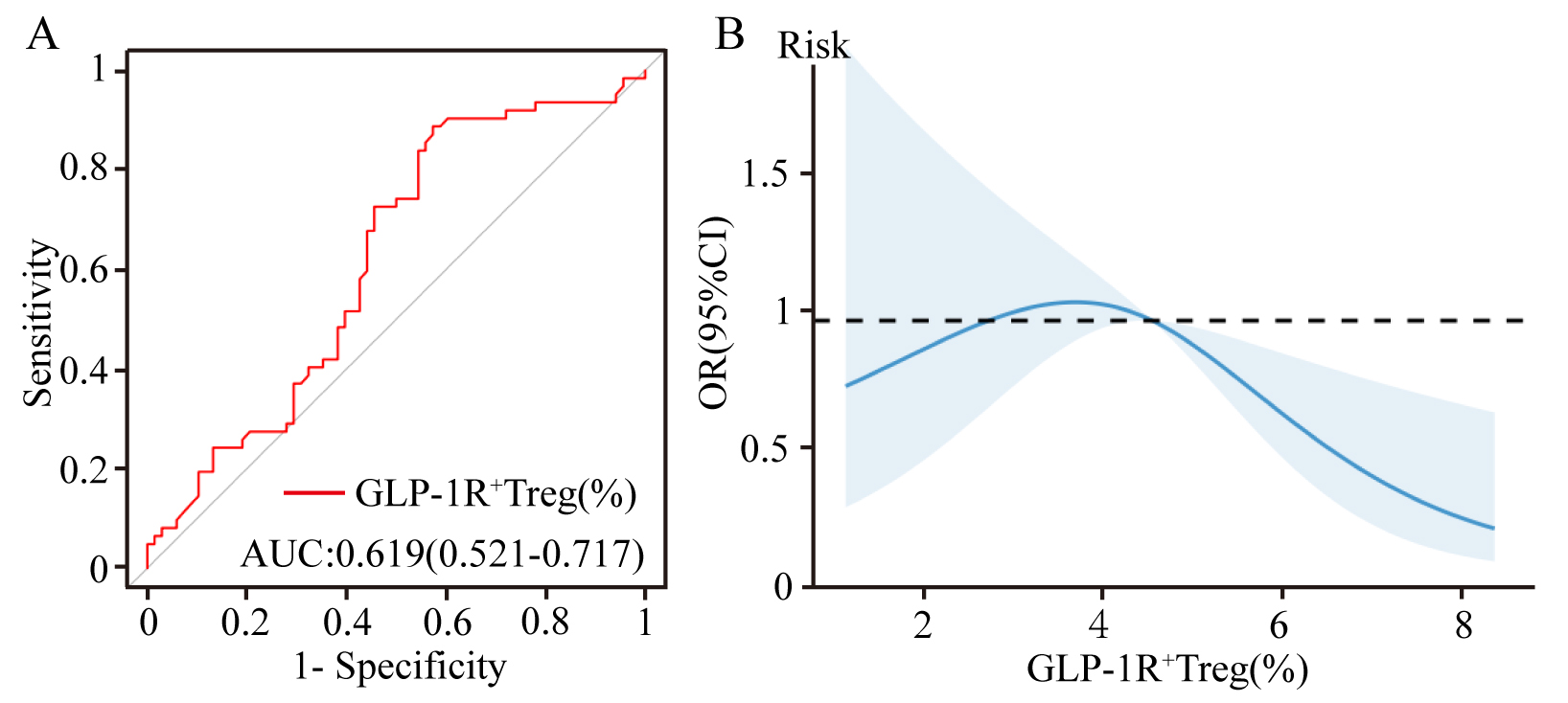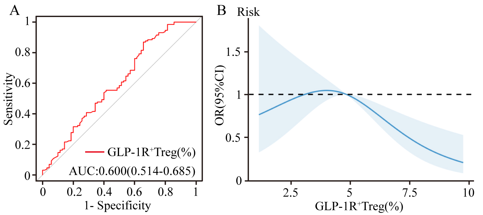 Fig. 2. Predictive and dose-response relationships of GLP-1R+ Tregs in CHD risk assessment. (A) Receiver operating characteristic (ROC) curve analysis evaluating the discriminative capacity of the GLP-1R+ Treg frequency (% of total Tregs) for CHD risk stratification (AUC: 0.600). (B) Restricted cubic spline (RCS) model illustrating the nonlinear inverse association between GLP-1R+ Treg frequency and CHD risk.