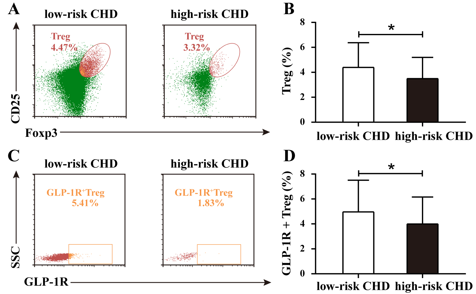 Fig. 3. Proportions of Treg and GLP-1R+ Treg cells in low-risk and high-risk CHD groups. (A) Representative flow cytometry plots of Treg proportions in low-risk and high-risk CHD groups. (B) Comparative analysis of Treg proportions between the low-risk CHD group and high-risk CHD group. (C) Representative flow cytometry plots of GLP-1R+ Treg proportions in low-risk and high-risk CHD groups. (D) Comparative analysis of GLP-1R+ Treg cell proportions between groups. Data are expressed as the means