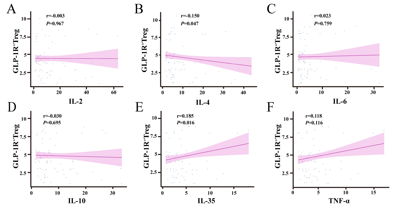 To investigate the regulatory role of GLP-1R+ Treg cells in cytokine networks, correlation analyses were performed between their proportions and key cytokine levels in the study cohort. A statistically significant negative correlation was observed between GLP-1R+ Treg cells and interleukin-4 (IL-4) levels (r = –0.150, p = 0.047; Fig. 5B), whereas a significant positive correlation was detected with interleukin-35 (IL-35) levels (r = 0.185, p = 0.016; Fig. 5E). No significant associations were found with other cytokines, including interleukin-2 (IL-2; r = –0.003, p = 0.967; Fig. 5A), interleukin-6 (IL-6; r = 0.023, p = 0.759; Fig. 5C), interleukin-10 (IL-10; r = 0.030, p = 0.695; Fig. 5D), or tumor necrosis factor-alpha (TNF-
