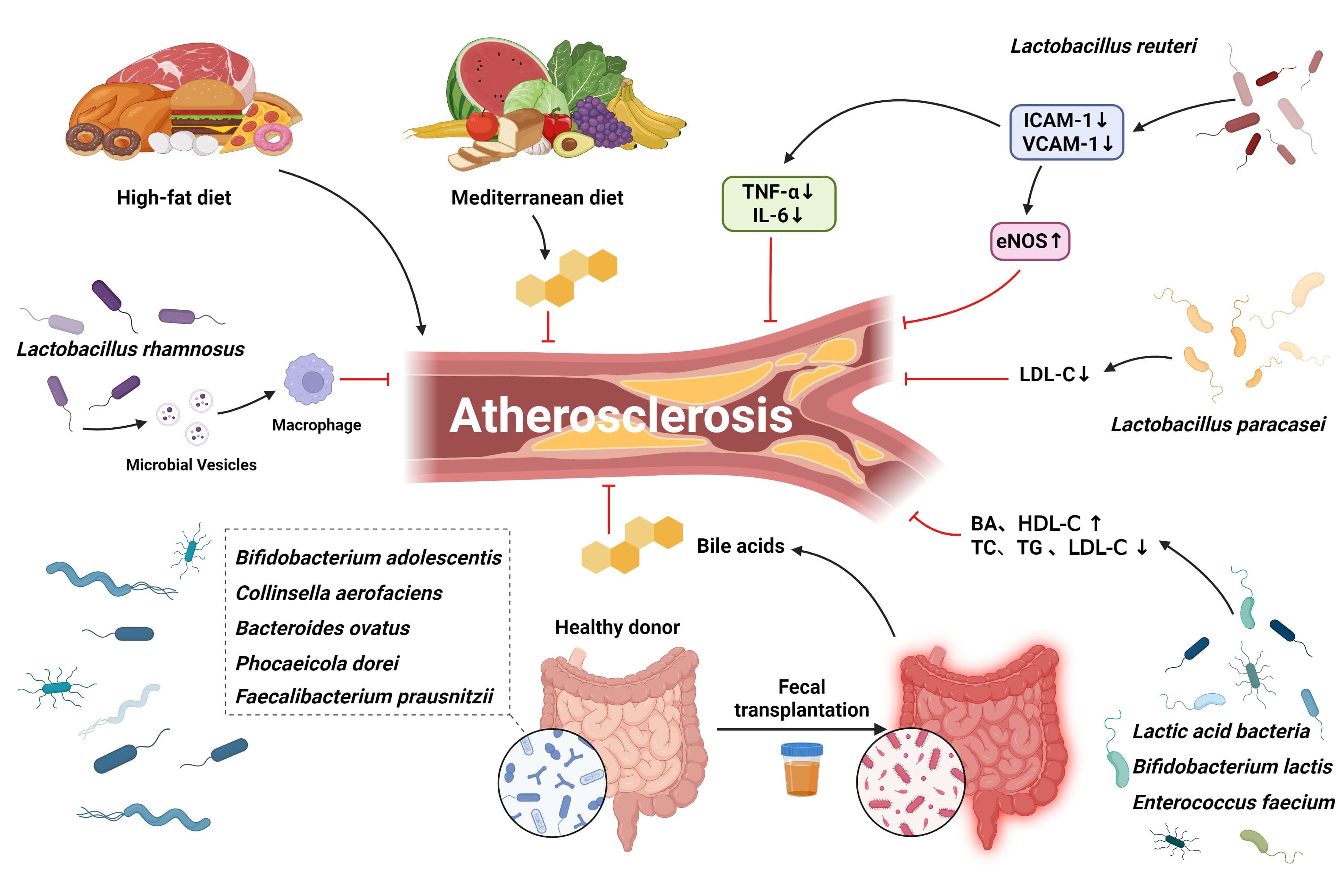 To sum up, intestinal microbiota correlates intimately with various forms of cardiovascular diseases. BAs, one of the byproducts of intestinal microbiota-catalyzed biotransformation, have emerged as promising candidates for elucidating the mechanisms underlying the eliciting of atherosclerosis by gut microbiota. Correspondingly, these observations offer novel concepts for the subsequent development of interventions targeting the intestinal microbiota for atherosclerosis treatment. From a clinical perspective, these findings highlight the potential value of gut microbiota and BA-related biomarkers in risk stratification, prevention, and management of atherosclerosis. They also open new avenues for therapeutic intervention, examples of which include dietary modifications, probiotics, prebiotics, and FMT. The modulation of intestinal microbiota composition and the targeting of elevated BA levels represent promising avenues for the treatment of atherosclerosis. For researchers, these advances underscore the necessity of conducting in-depth mechanistic studies, large-scale multiethnic cohort investigations, and well-designed clinical trials to validate causal relationships and evaluate therapeutic efficacy. In the future, additional microbiota-derived metabolites associated with atherosclerosis are expected to be identified, which will further advance the development of safer and more effective microbiota- and BA-targeted therapeutic strategies, ultimately helping to reduce the global burden of cardiovascular diseases.