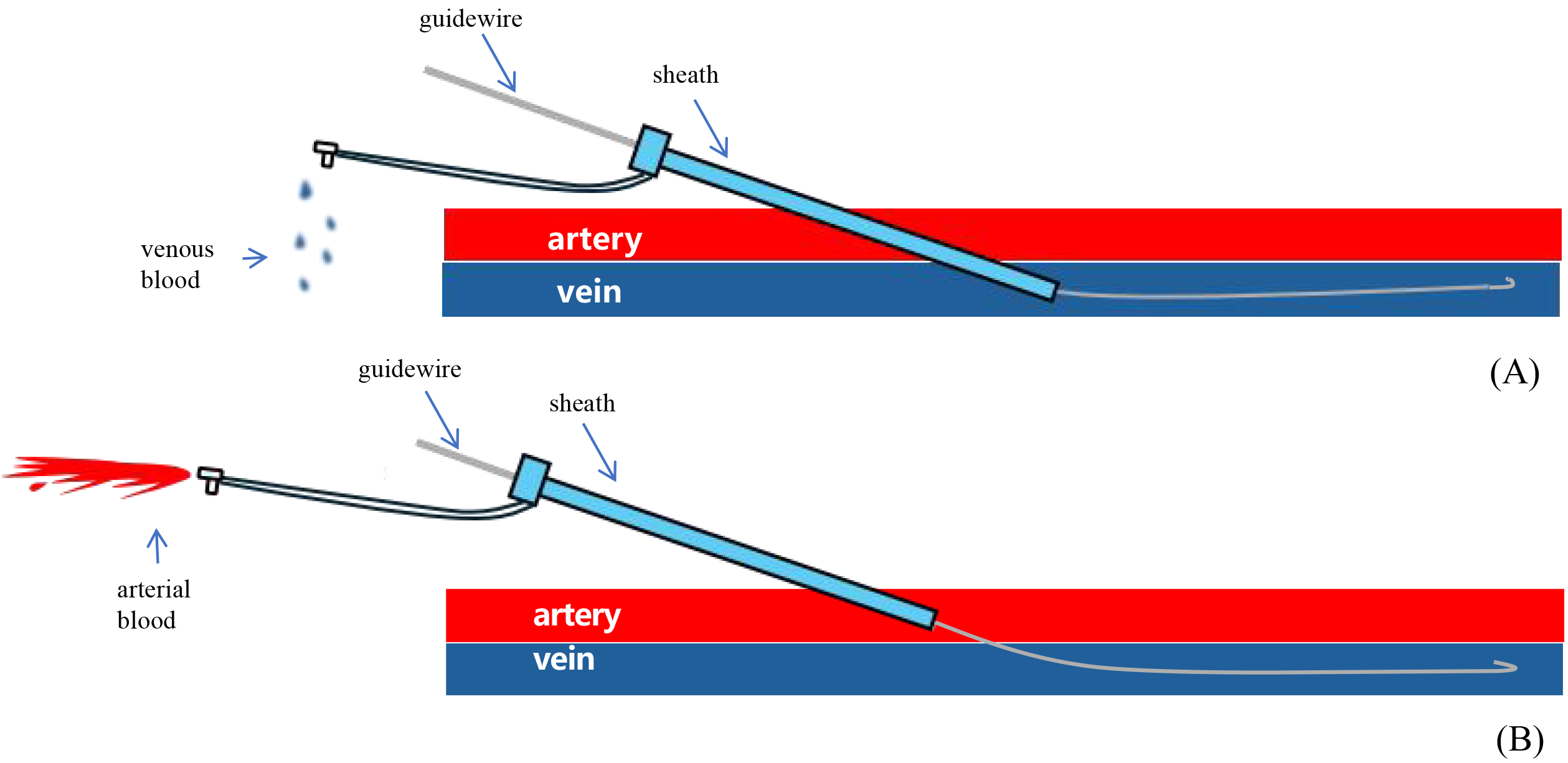 Liu’s vascular examination method: maintain the position of the guidewire while gradually withdrawing the sheath. (A) The sheath punctured the vein without damaging the artery: the velocity of venous blood flow is reduced, resulting in a dark red coloration. (B) The sheath has traversed the arterial vessel and penetrated the vein: arterial blood flow is characterized by rapid velocity and a vibrant crimson coloration.