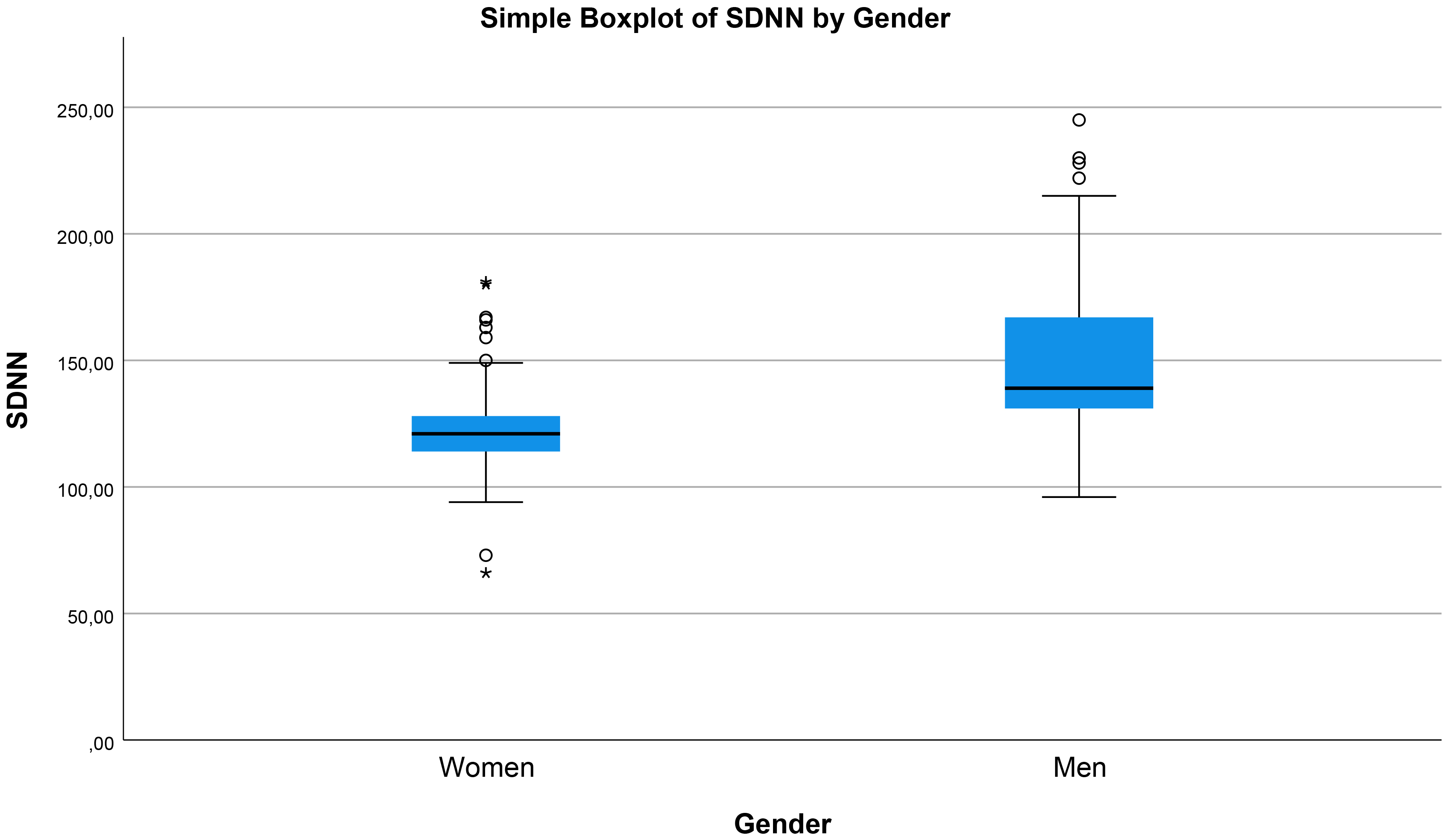 sex, showing a higher median SDNN in men than in women. Outliers are displayed