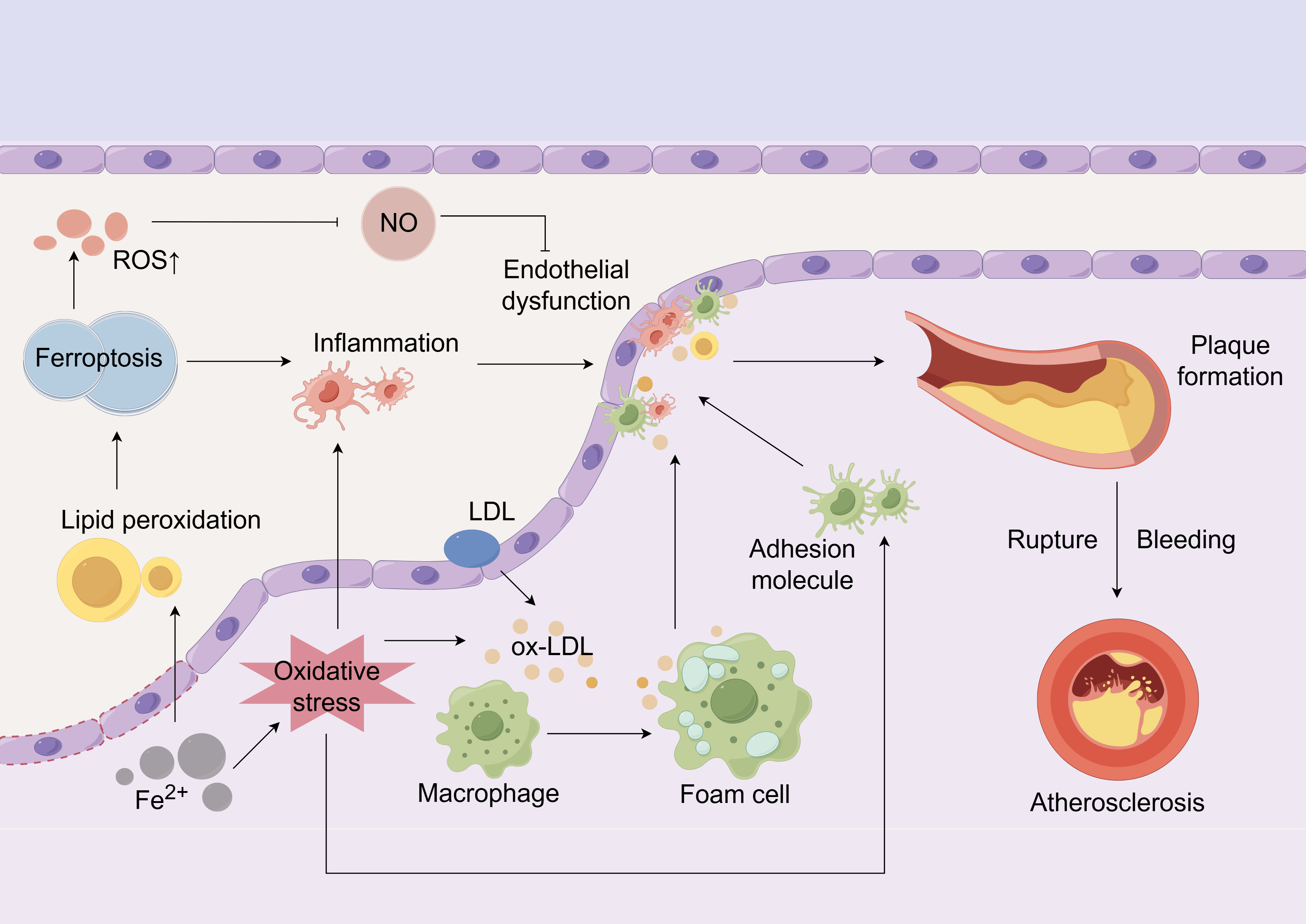 Ferroptosis is associated with the pathogenesis of atherosclerosis. Endothelial dysfunction lets LDL penetrate and be oxidized to ox-LDL; Fe2+ buildup heightens oxidative stress and lipid ROS, prompting macrophages to form foam cells that undergo ferroptosis, spill inflammatory mediators, recruit more immune cells and enlarge the necrotic core, together expanding the plaque until the fibrous cap ruptures, platelets adhere and bleeding/thrombosis ensue. Concurrently, excessive ROS caused by ferroptosis inhibits NO activity, further damaging the endothelium and exacerbating inflammation and endothelial dysfunction. LDL, low-density lipoprotein; ROS, reactive oxygen species; NO, nitric oxide. The Fig. 1 was created using the following online platform: https://www.figdraw.com. Copyright Code: AIPRAffdfa. Manufacturer Location: Hangzhou City, Zhejiang Province, China.