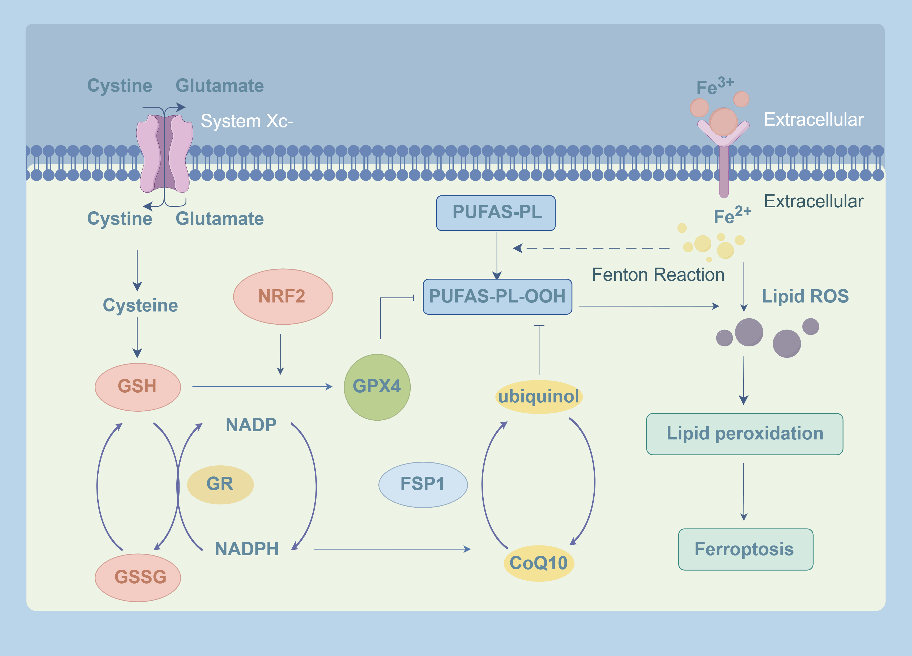 The FSP1-CoQ10-NADPH pathway functions as a GPX4-independent system for suppressing ferroptosis [99]. FSP1, initially identified as a pro-apoptotic factor, protects against ferroptosis induced by GPX4 deficiency [100]. Myristoylated FSP1 is recruited to the plasma membrane, where it uses NADPH to CoQ10 into ubiquinol, a potent lipophilic antioxidant that terminates lipid peroxidation chains [101, 102].