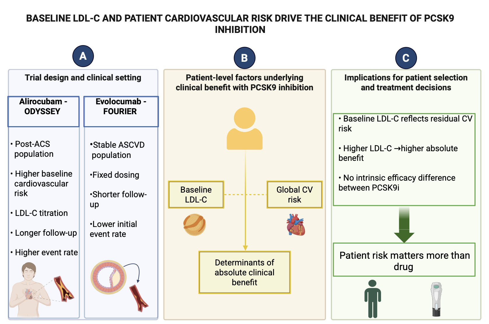 Baseline LDL-C and patient cardiovascular risk drive the clinical benefit of PCSK9 inhibition. (A) Summarizes the main differences in trial design and clinical setting between alirocumab in ODYSSEY OUTCOMES and evolocumab in FOURIER. ODYSSEY OUTCOMES enrolled patients after acute coronary syndrome, characterized by higher baseline cardiovascular risk, LDL-C titration and longer follow-up, whereas FOURIER included patients with stable atherosclerotic cardiovascular disease treated with fixed-dose evolocumab and lower initial event rates. Figure legends: ACS (acute coronary syndrome), LDL-C (Low-Density-Lipoprotein cholesterol), ASCVD (stable atherosclerotic cardiovascular disease), CV (cardiovascular), PCSK9i (Proprotein convertase subtilisin/kexin type 9 inhibitors). (B) Schematically illustrates the patient-related factors underlying the magnitude of absolute clinical benefit with PCSK9 inhibition. Baseline LDL-C levels and global cardiovascular risk are shown as coexisting and complementary determinants that define residual cardiovascular risk and, consequently, the potential absolute benefit of treatment. The schematic emphasizes that clinical benefit is primarily driven by patient characteristics rather than by differences between PCSK9 inhibitor molecules. (C) Outlines the clinical implications, indicating that baseline LDL-C reflects residual cardiovascular risk and potential absolute benefit, without intrinsic efficacy differences between PCSK9 inhibitors; therefore, patient risk profile rather than molecule choice should guide clinical decision-making.