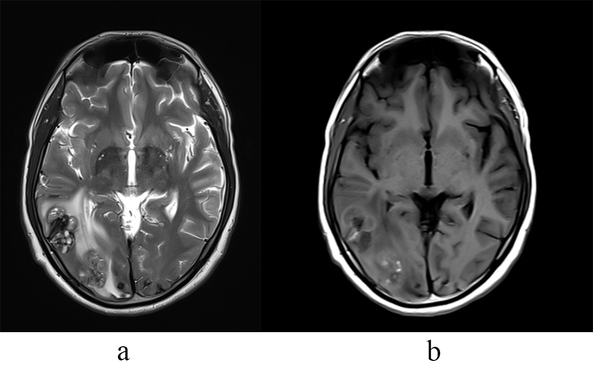 Fig. 1. Right temporo-occipital lesions on MRI. (a) T2W MRI shows right temporo-occipital lesions with heterogeneous signal and edema. (b) T1 Post contrast shows mild heterogeneous enhancement. T2W MRI, T2 weighted magnetic resonance imaging.
