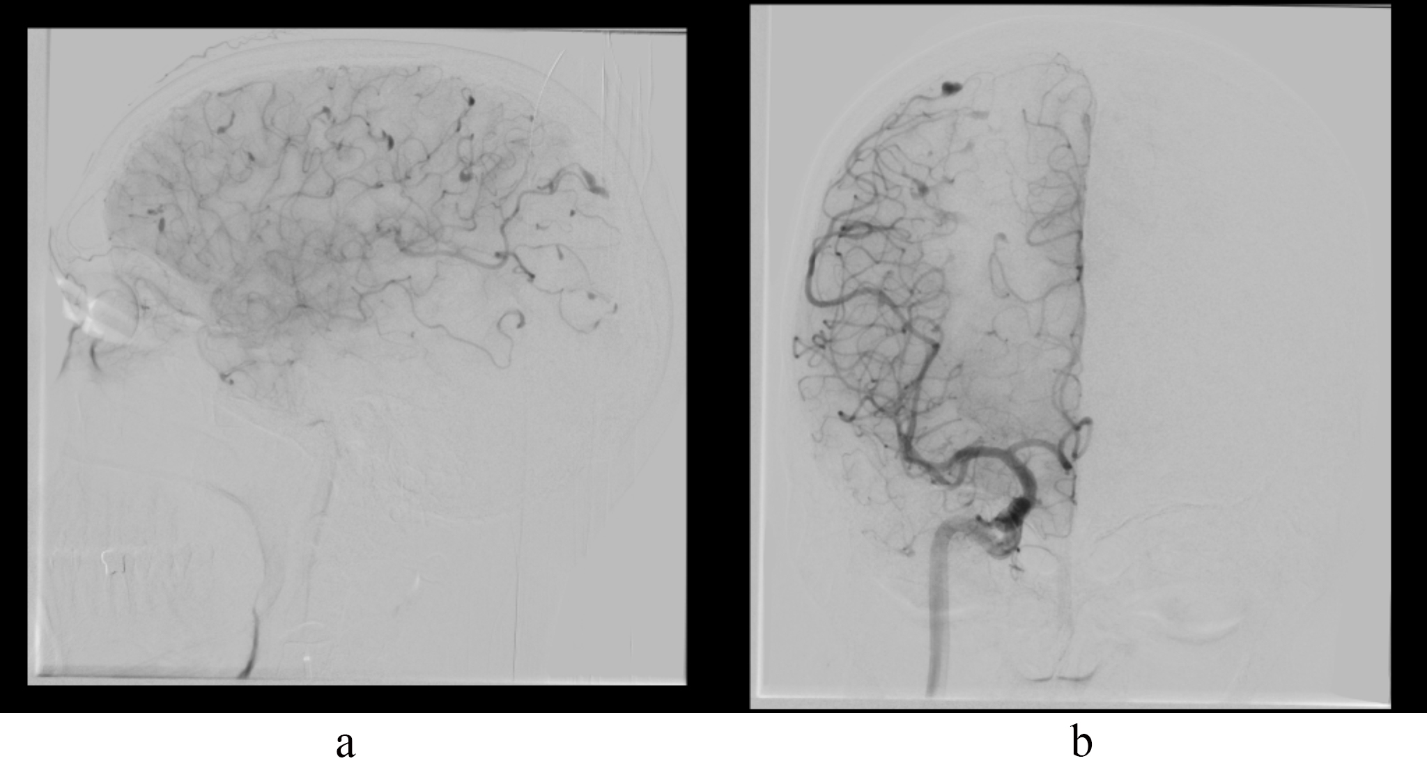 Fig. 2. Multiple fusiform aneurysms on DSA. (a) DSA lateral view shows multiple fusiform aneurysms in ACA and MCA cortical branches. (b) DSA AP view shows multiple fusiform aneurysms in ACA and MCA cortical branches. DSA, digital subtraction angiography; ACA, anterior cerebral artery; MCA, middle cerebral artery; AP, antero-posterior view.