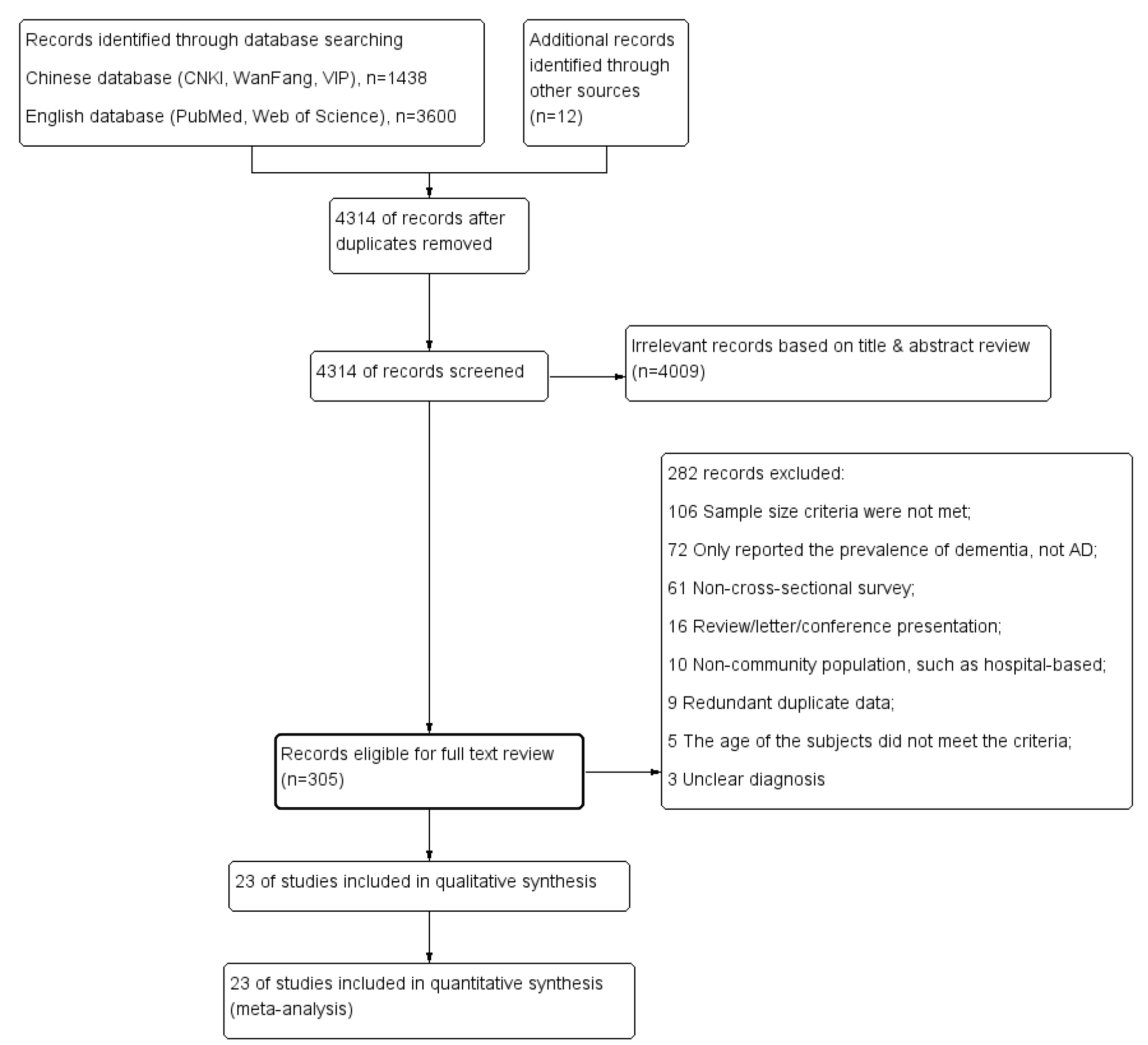 A total of 5050 studies were initially retrieved. According to the inclusion and exclusion criteria, 23 articles (16 in Chinese and 7 in English) were ultimately included in the detailed analysis. The literature retrieval process is illustrated in Fig. 1. Across these 23 articles, the combined sample size totaled 307,415 individuals, with 13,662 cases of AD being specifically reported. The quality scores of these articles ranged from 4 to 8, and general information of the included articles is presented in Table 1 (Ref. [9, 10, 11, 12, 13, 14, 15, 16, 17, 18, 19, 20, 21, 22, 23, 24, 25, 26, 27, 28, 29, 30, 31]).