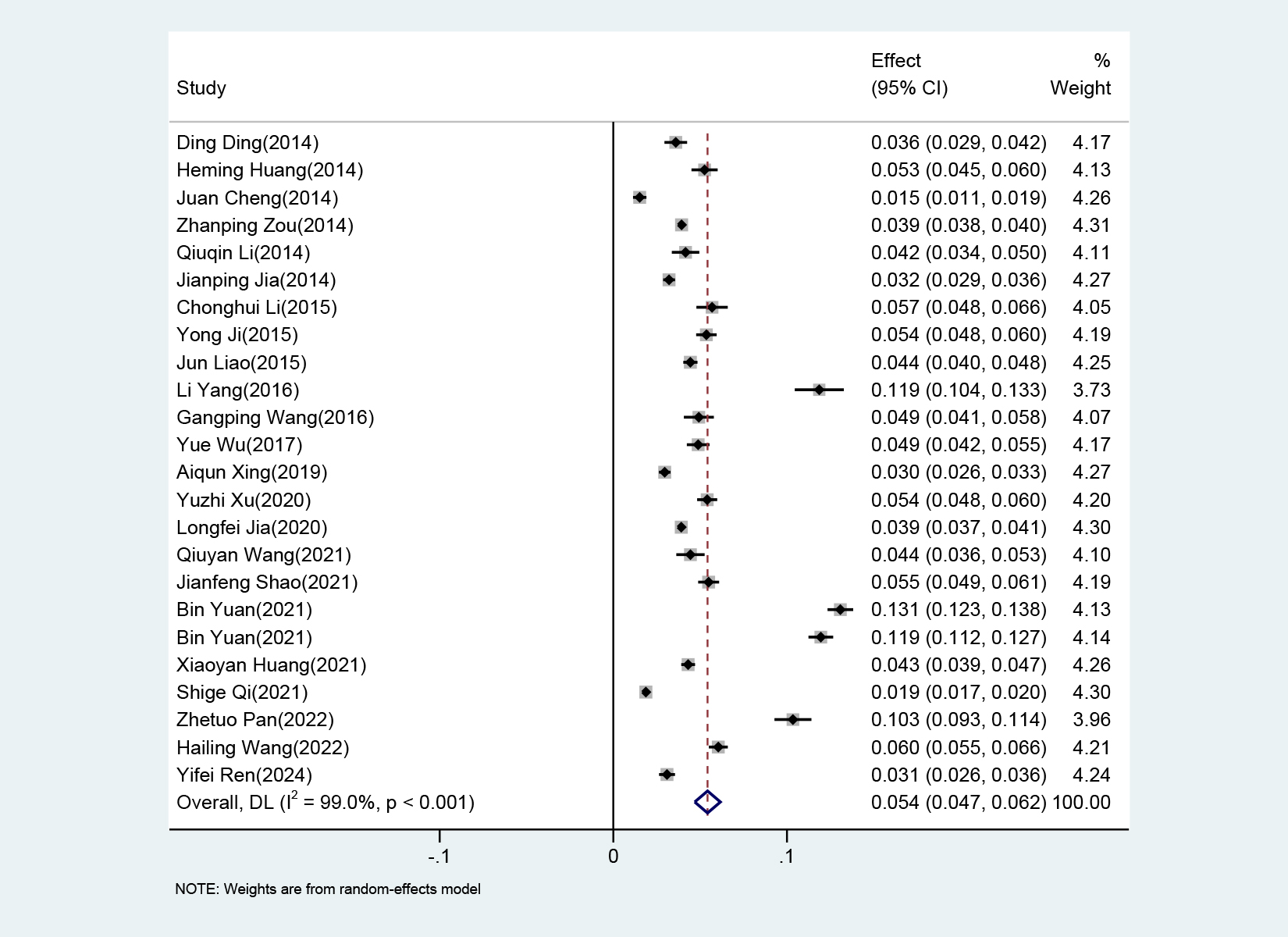 A total of 23 studies were included, with a total sample size of 307,415, including 13,662 patients with AD. The results of the meta-analysis showed that the prevalence of AD among the elderly Chinese population was 5.4% (95% CI: 4.7%–6.2%). The results of the meta-regression indicated that factors such as female sex, advanced age, low educational level, rural residence, and geographical region are the main factors influencing the prevalence of AD.