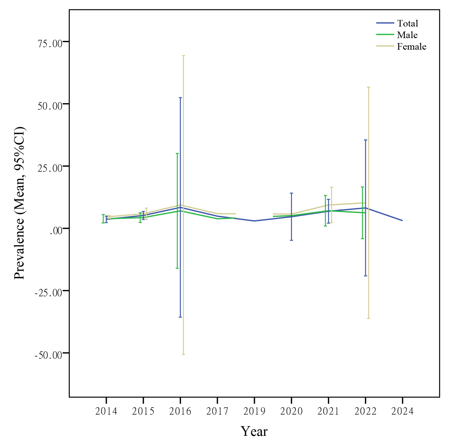 Among the 23 included studies, 16 studies explicitly provided the prevalence data for the different genders. The prevalence of AD among females were 7.2% (95% CI: 6.0%–8.4%), significantly higher than the prevalence among males (5.4%, 95% CI: 4.3%–6.4%) (