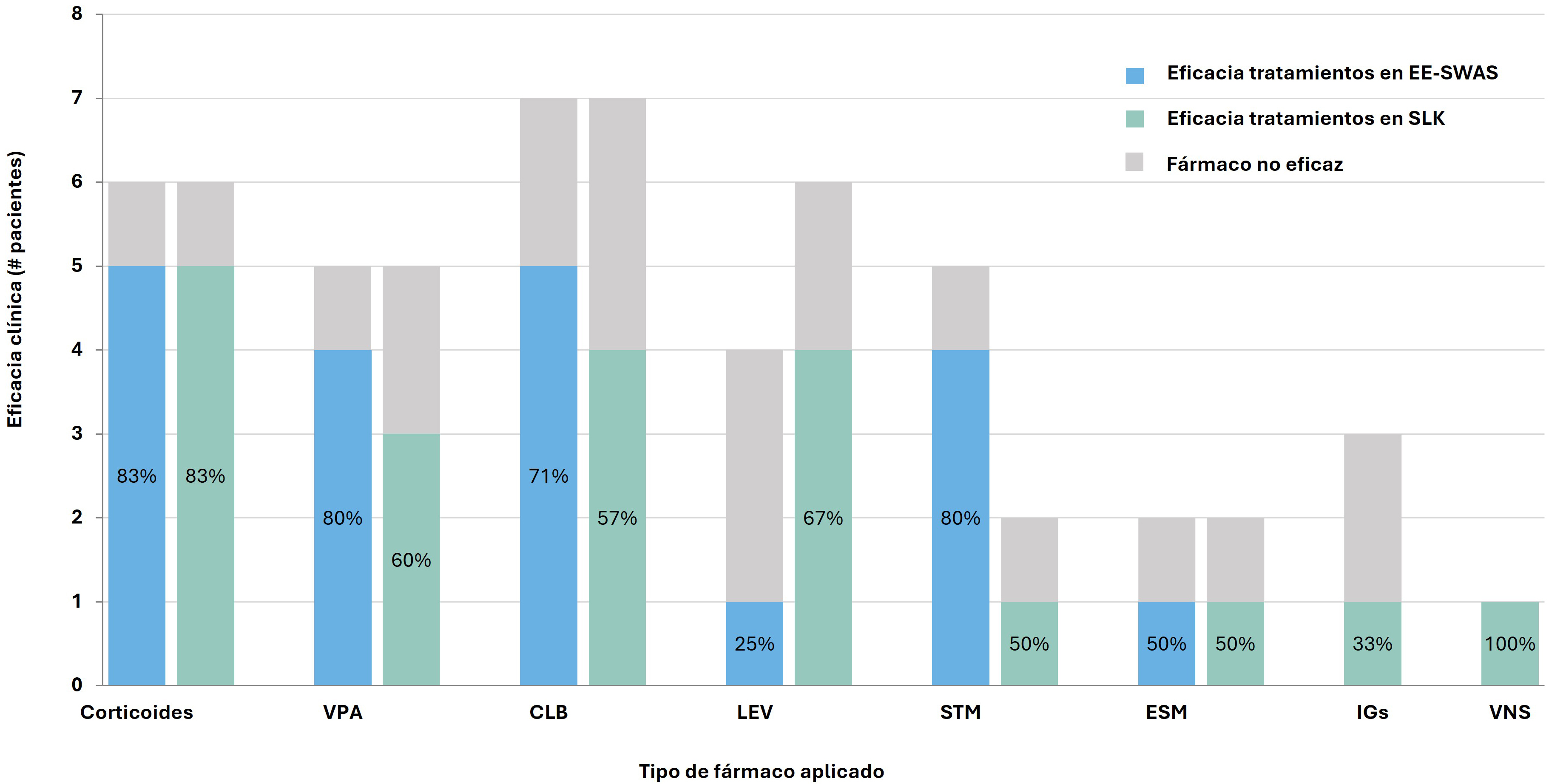 Eficacia de los tratamientos empleado en ambos grupos (EE-SWAS, SLK). VPA, ácido valproico; CLB, clobazam; LEV, levetiracetam; STM, sultiame; ESM, etosuximida; IGs, inmunoglobulinas; VNS, estimulador del nervio vago.