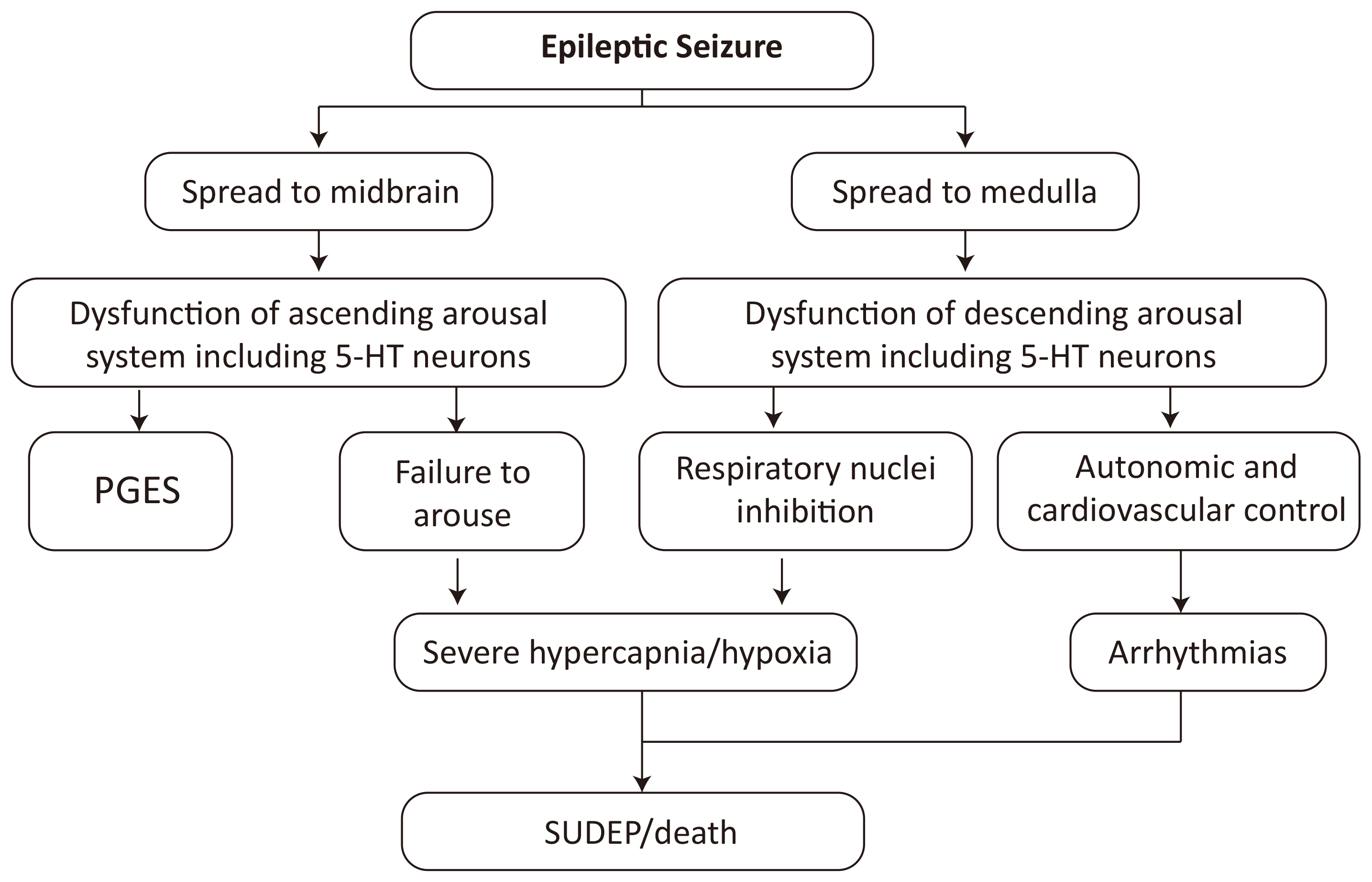 Massey et al. [36] proposed a hypothesis of SUDEP mechanism: aberrant discharges spread to the ascending arousal system containing serotonin neurons in the midbrain, leading to failure of arousal in prone patients and eventually resulting in asphyxiation; the spread of aberrant discharges to the descending neural pathway containing serotonin neurons in the medulla oblongata inhibits respiratory-related nuclei and affects the regulation of cardiac autonomic nerve, thus leading to hypoventilation, arrhythmias, and even death (Fig. 1, Ref. [36]).