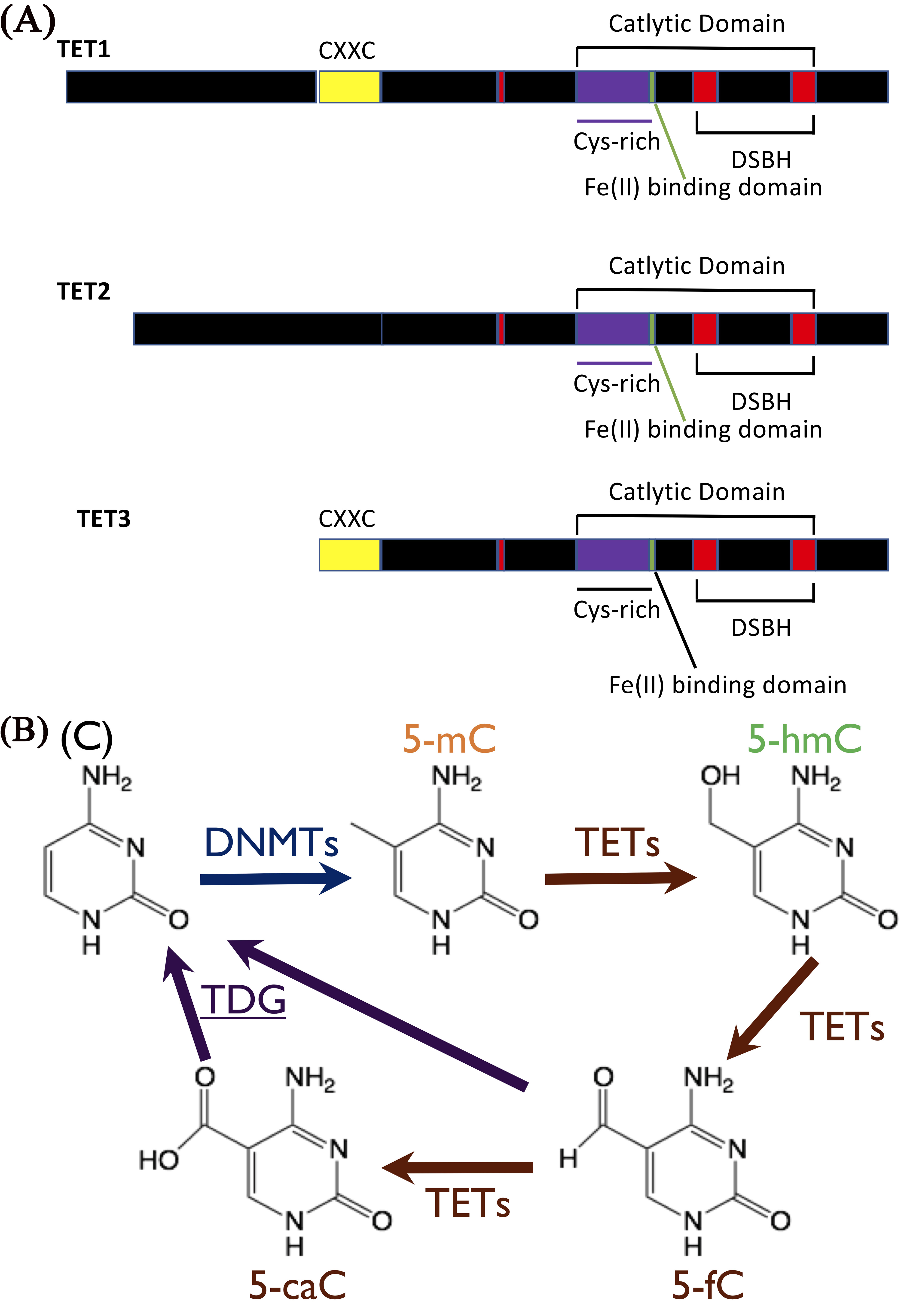 and TETs-mediated hydroxymehtylation. (A) TETs, including TET1, TET2, and TET3,