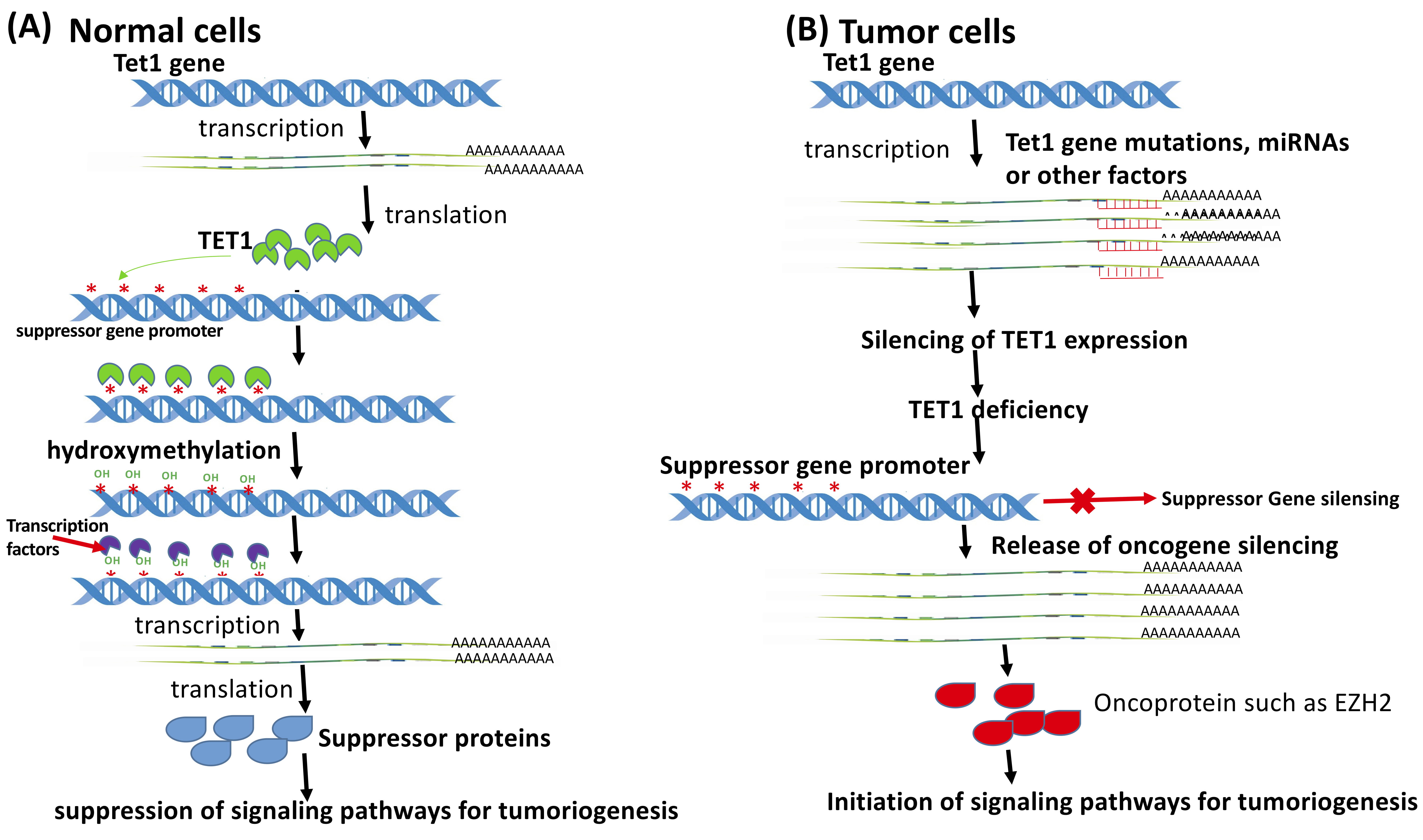 Fig. 2.TET1 functions as a tumor suppressor. (A) In normal cells, TET1 expression is maintained at a regular level. TET1 is recruited to the methylated promoter area of the tumor suppressor genes for demethylation so that the tumor suppressor could be expressed at normal levels. (B) Due to the mutation of Tet1 genes and other factors, Tet1 expression was silenced, leading to the silencing of the suppressor genes and activation of the oncogenes, such as Ezh2. Expression of the oncoproteins initiates tumorigenesis or enhances cancer cell growth and metastasis (Cited and modified from Ma et al., Cytosine Modifications and Distinct Functions of TET1 on Tumorigenesis. Chromatin and Epigenetics Eds. By Dr. Colin Logie and Dr. Tobias Knoch, The Netherland 2019. Intechopen.83709 http://dx.doi.org/10.5772/intechopen.83709) [95].