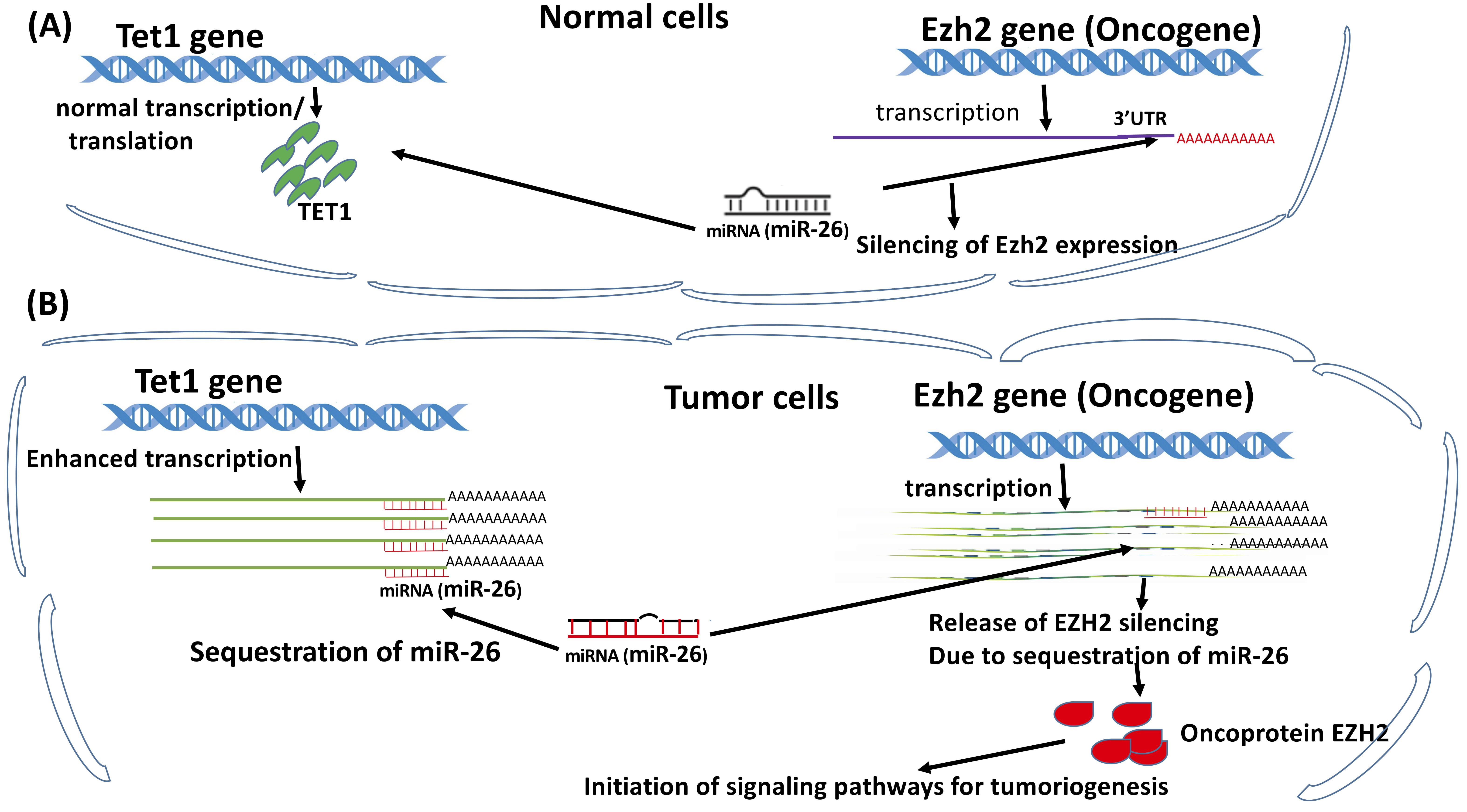 It has been shown that the interplay of TET3/DNMT3B mRNAs as novel competing endogenous RNAs (ceRNAs) functions as a suppressor through PTEN inactivation. PTEN inactivation caused by multiple genetic and epigenetic regulatory mechanisms contribute to oncogenesis. Epigenetically, ceRNAs in ncRNA dependent and coding independent regulation of the genes have been implicated in the regulation of PTEN expression. mRNAs of both Dnmt3B and Tet3 collectively function as novel ceRNAs of PTEN on the basis of sharing multiple miRNAs targeting their 3’UTRs, potentially affecting their dose sensitive tumor suppressive function. Reciprocal 3’UTR overexpression leads to competitive miRNA sequestration and subsequent activation of the PTEN pathway. Indeed, overexpression of 3’UTR for Dnmt3B or Tet3 strongly enhanced apoptosis and attenuated cell migration and evasion. Therefore, this study suggests that the dictatorship conferred by the number of miRNAs they share, and potentially by the existence of other ceRNA networks in which they participate, could determine the orchestrated phenotype [162].