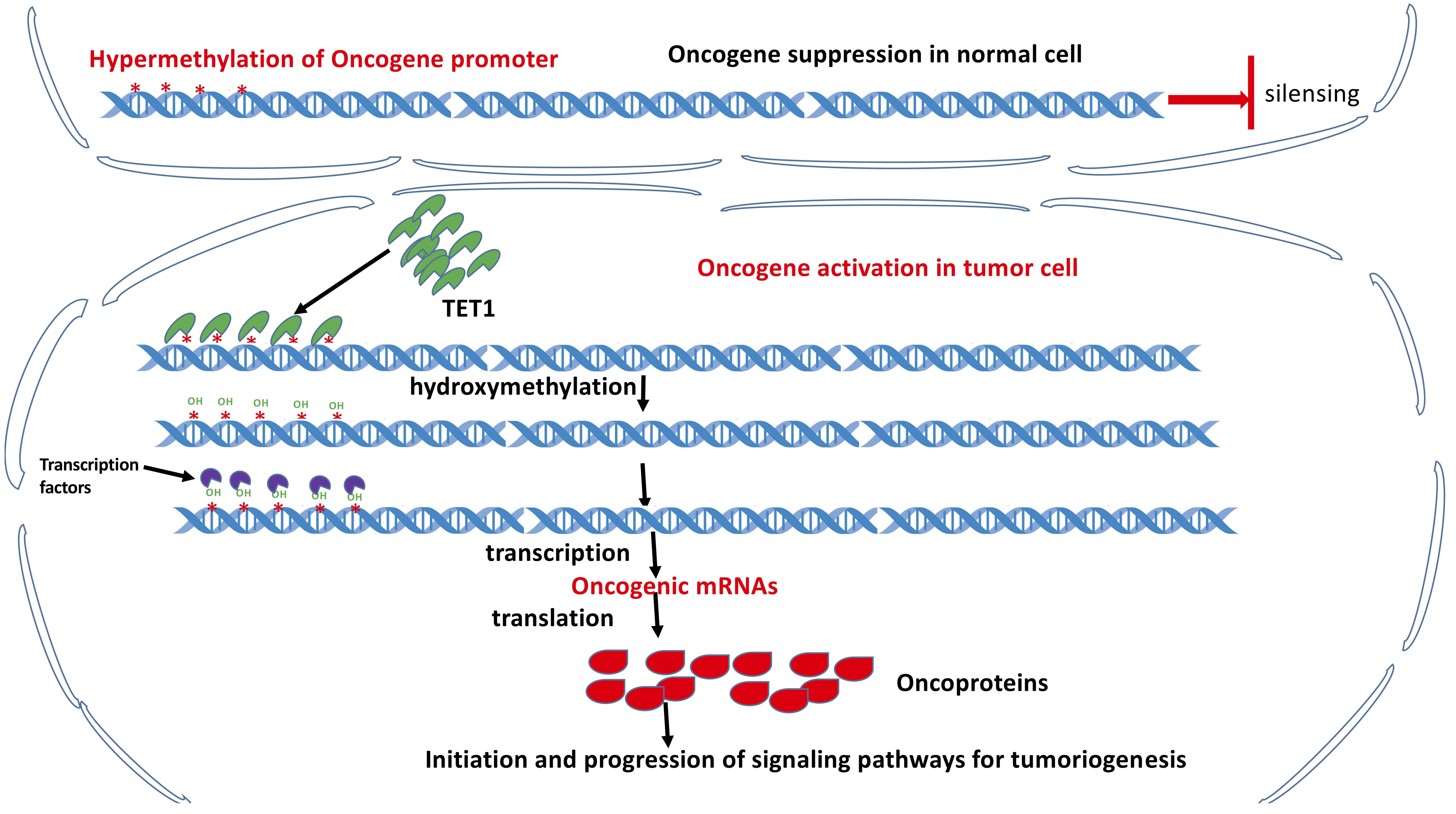 Fig. 4.Activation of the oncogenes via TET protein mediated hydroxymethylation of the methylated promoter regions in the oncogenes, thereby TET functioning as tumor promoters. (A) Under normal conditions, hypermethylation occurs at the promoter regions of the oncogenes, leading to their silencing. (B) In case TET proteins are recruited by their interaction partners to the hypermethylated promoter regions of the oncogenes, hydroxymethylation will be conducted by TET proteins, thereby activating the oncogenes and consequently leading to tumorigenesis. (Cited and modified from Ma et al., Cytosine Modifications and Distinct Functions of TET1 on Tumorigenesis. Chromatin and Epigenetics Eds. By Dr. Colin Logie and Dr. Tobias Knoch, The Netherland 2019. Intechopen.83709 http://dx.doi.org/10.5772/intechopen.83709) [95].