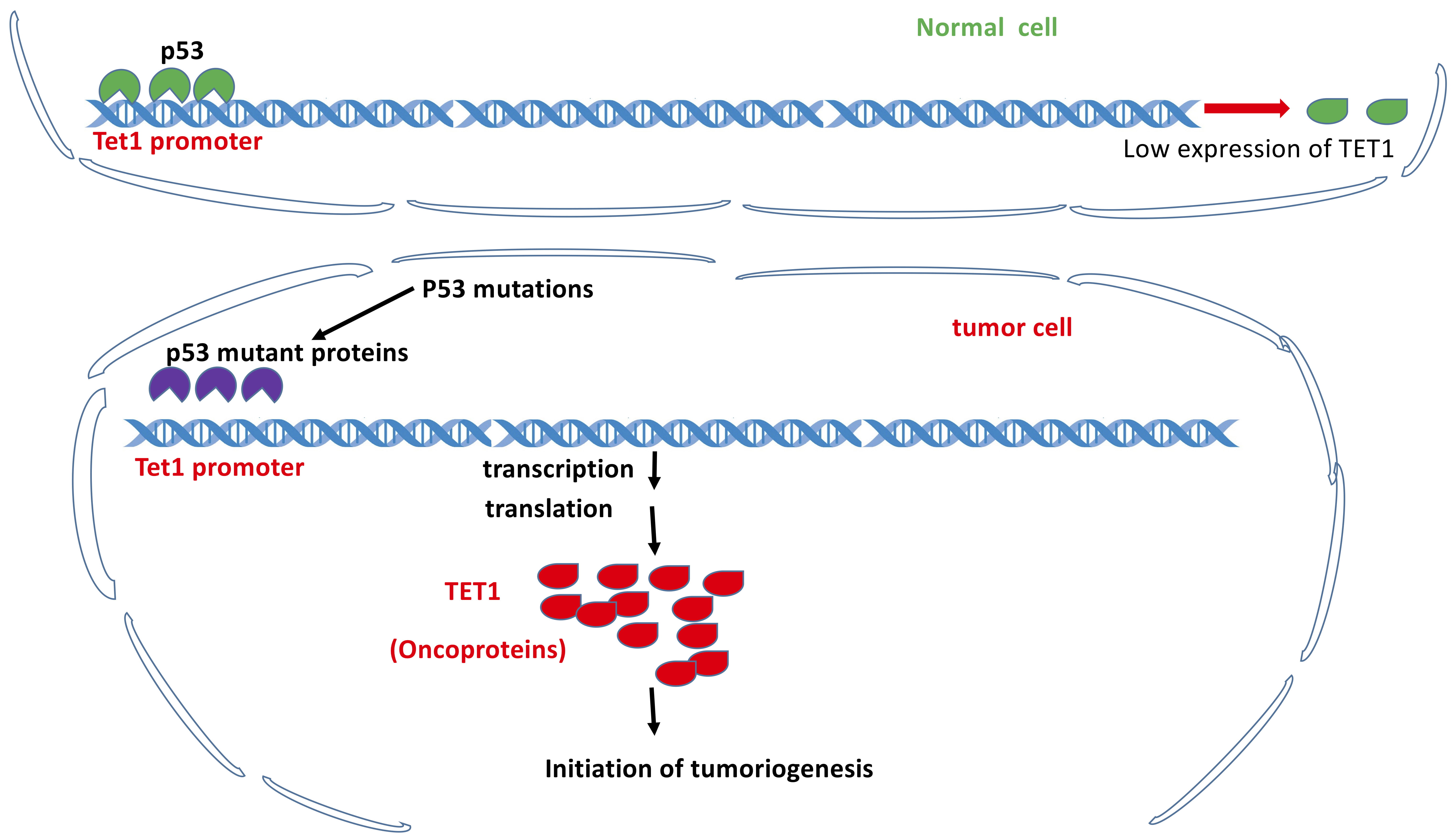 Fig. 5.TET1 as a tumor promoter independent of its demethylation activity but dependent on p53 loss of function. Under normal conditions, p53 binds to the promoter of Tet1 gene to maintain the low expression level of TET1 protein. Under the conditions of p53 loss of functions due to mutations, TET1 is overexpressed and functions as tumor promoter.
