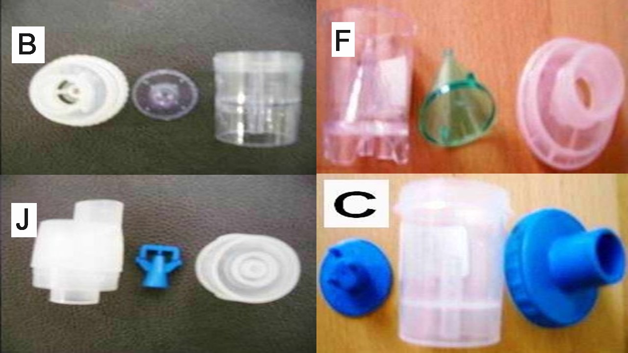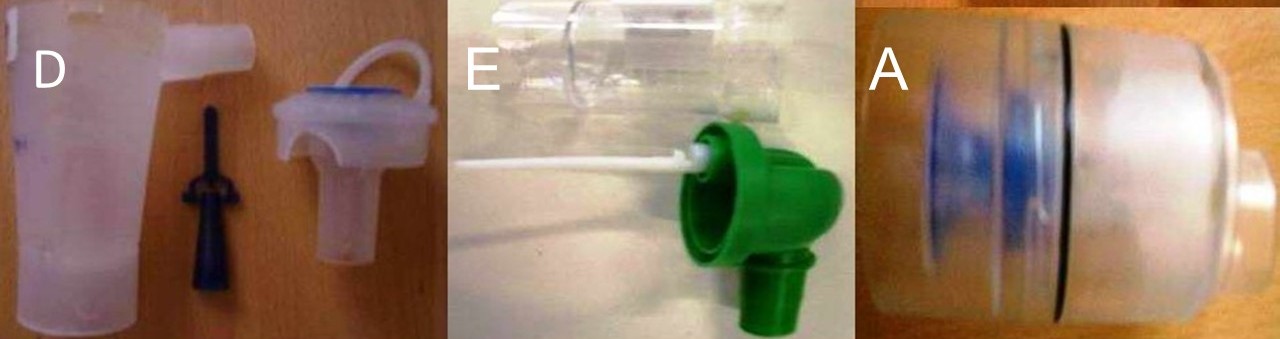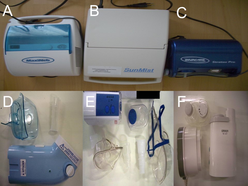 Fig. 1.Upper row with Jet-nebulizers, (A) Maxineb, (B) Sunmist and (C) Invacare. Lower row with ultrasound nebulisers, (D) Easyneb, (E) GIMA and (F) Omron.