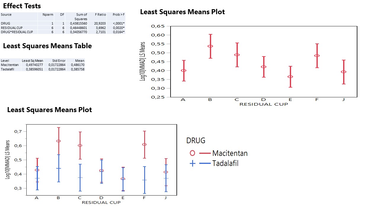 Concerning the jet-nebulizers, a four-way analysis (fixed effects) on mass median aerodynamic diameter (MMAD) response was employed using three types of nebulizers (INVACARE, MAXINEB, SUNMIST), two types of drugs (Macitentan, Tadalafil), four loading dose (mL) levels (2, 4, 6 ,8) and seven designs of residual cups (alphabet letters).