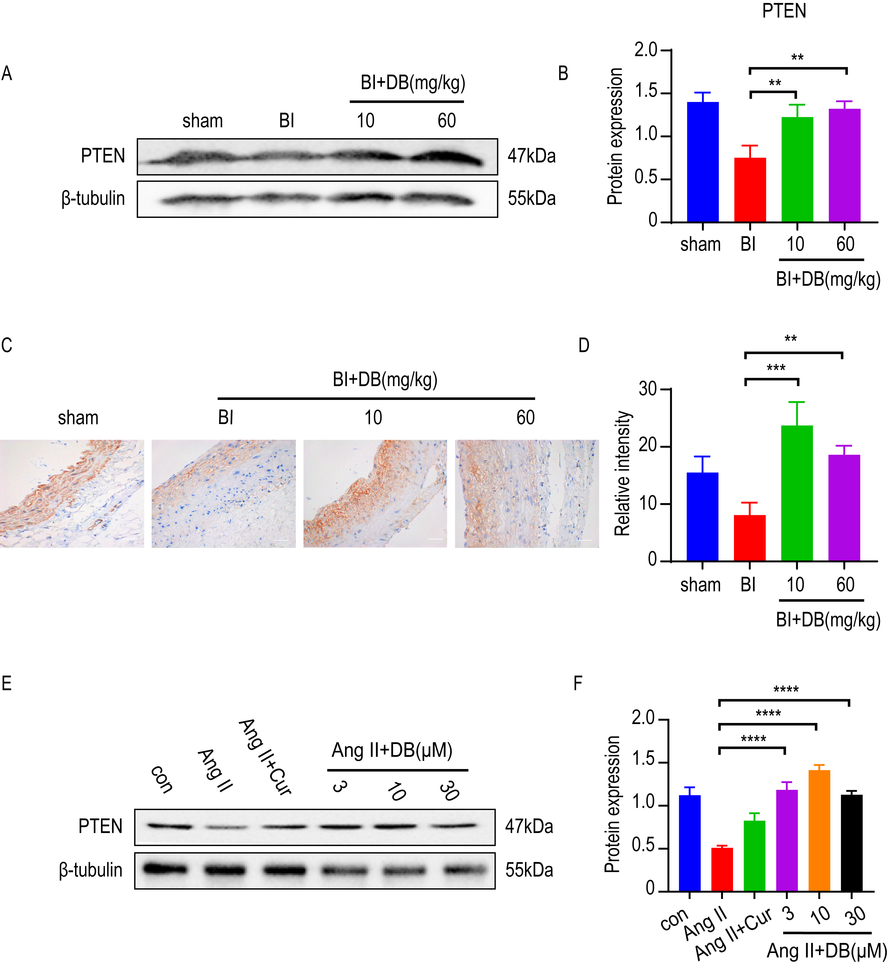 Increasing evidence [8, 11, 24] showed that PTEN was a potent regulator in inhibiting the proliferation and migration of VSMCs. To determine whether PTEN was involved in the activity of DB, we employed western blot and immunohistochemistry to measure the expression of PTEN in vivo. The results of western blot and immunohistochemistry showed that rat subjected to balloon injury resulted in a significant reduction of PTEN expression. Furthermore, the inhibition of PTEN induced by balloon-catheter injury was dramatically attenuated by DB treatment (Fig. 4A,B). We then measured the expression of PTEN in cultured VSMCs. Interestingly, Ang-II significantly decreased the expression of PTEN while DB treatment significantly increased the expression of PTEN in Ang-II induced VSMCs (Fig. 4B), indicating that DB may exert its effects via up-regulation of PTEN expression.